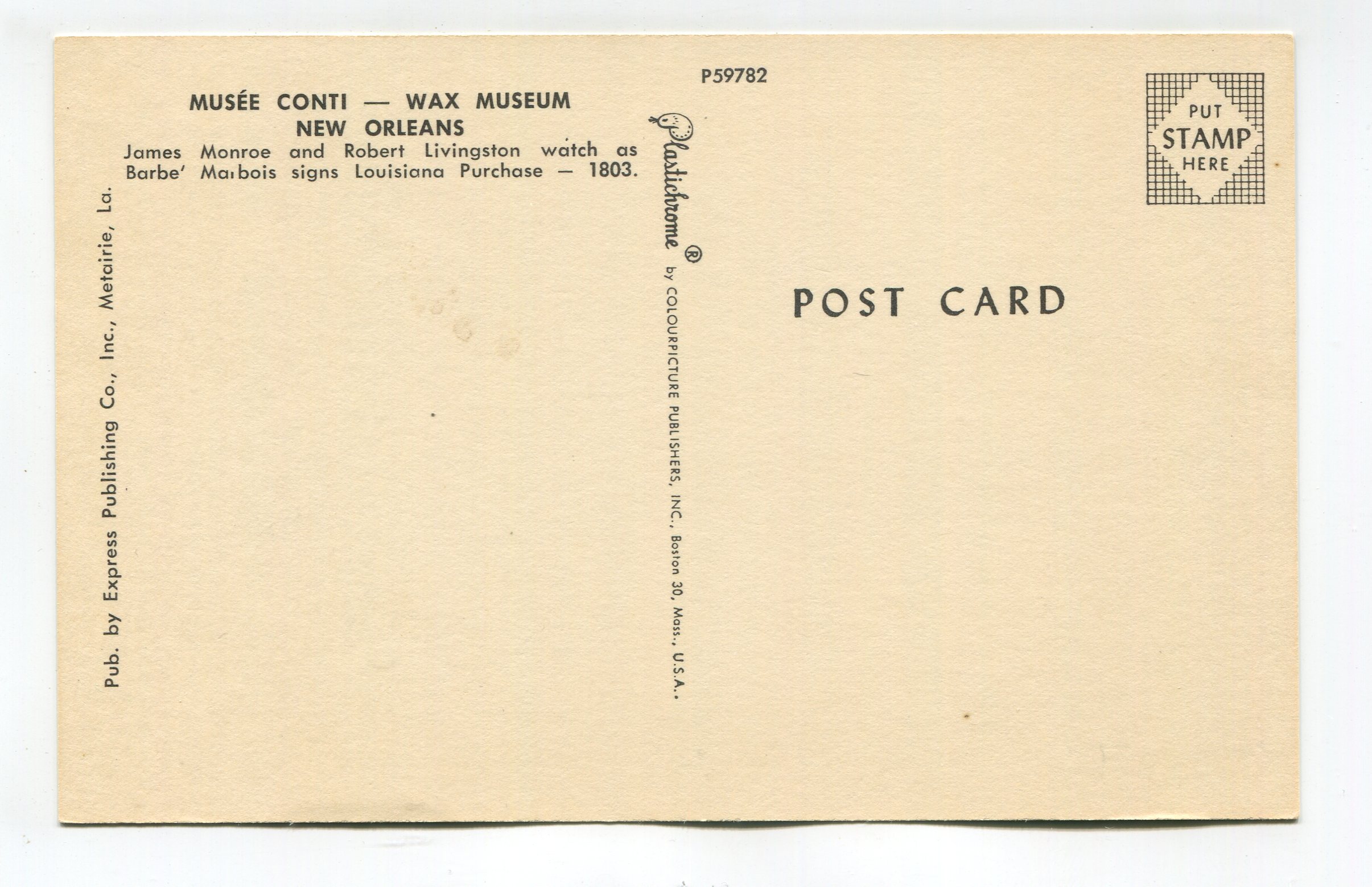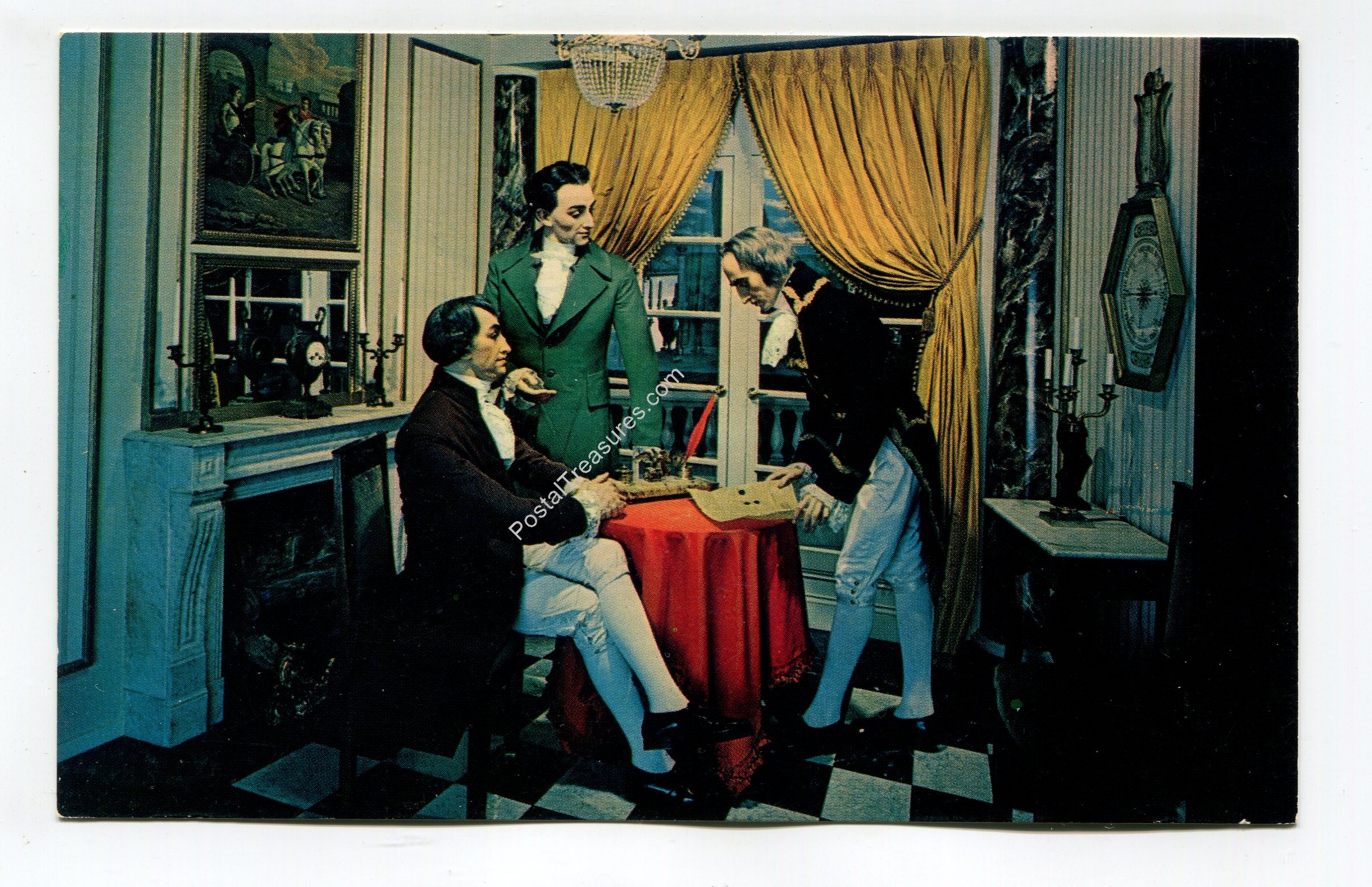 James Monroe and Robert Livingston watch as Barbe Marbois signs Louisiana Purchase Musee Conti Wax Museum New Orleans Louisiana postcard