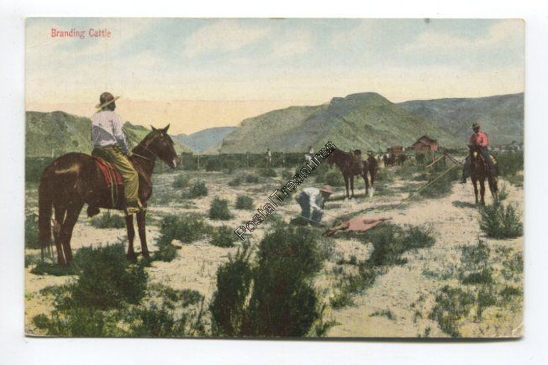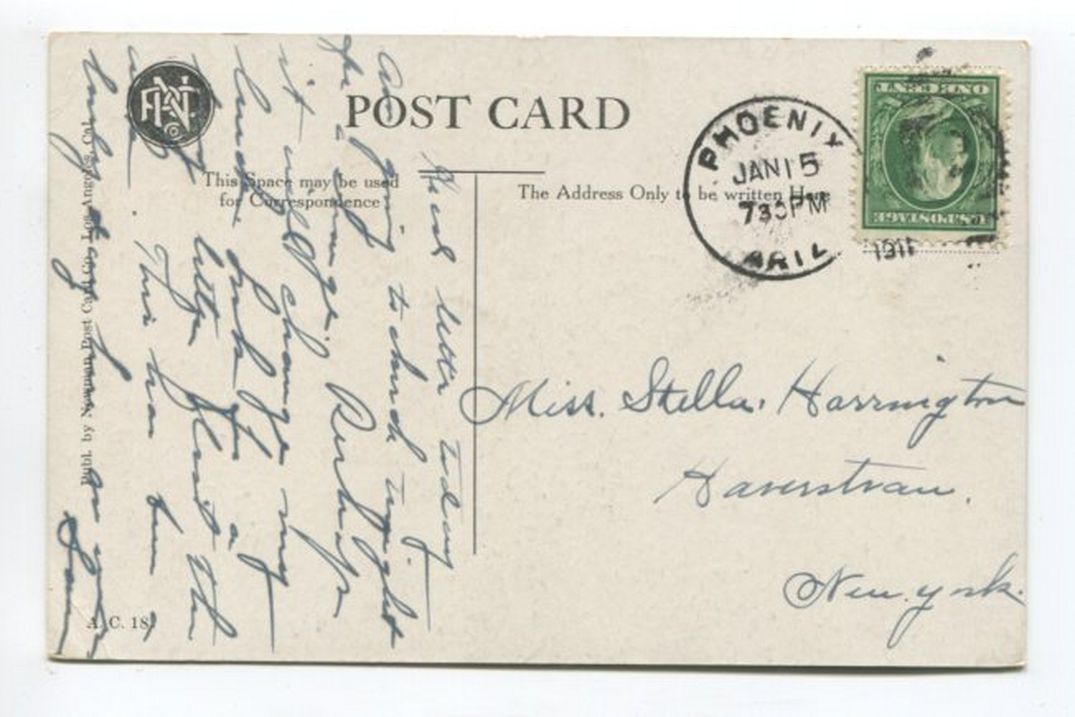 Condition – noticeable corner/edge wear, marks in skyline, cancellation impression visible on card front, soiling/marks