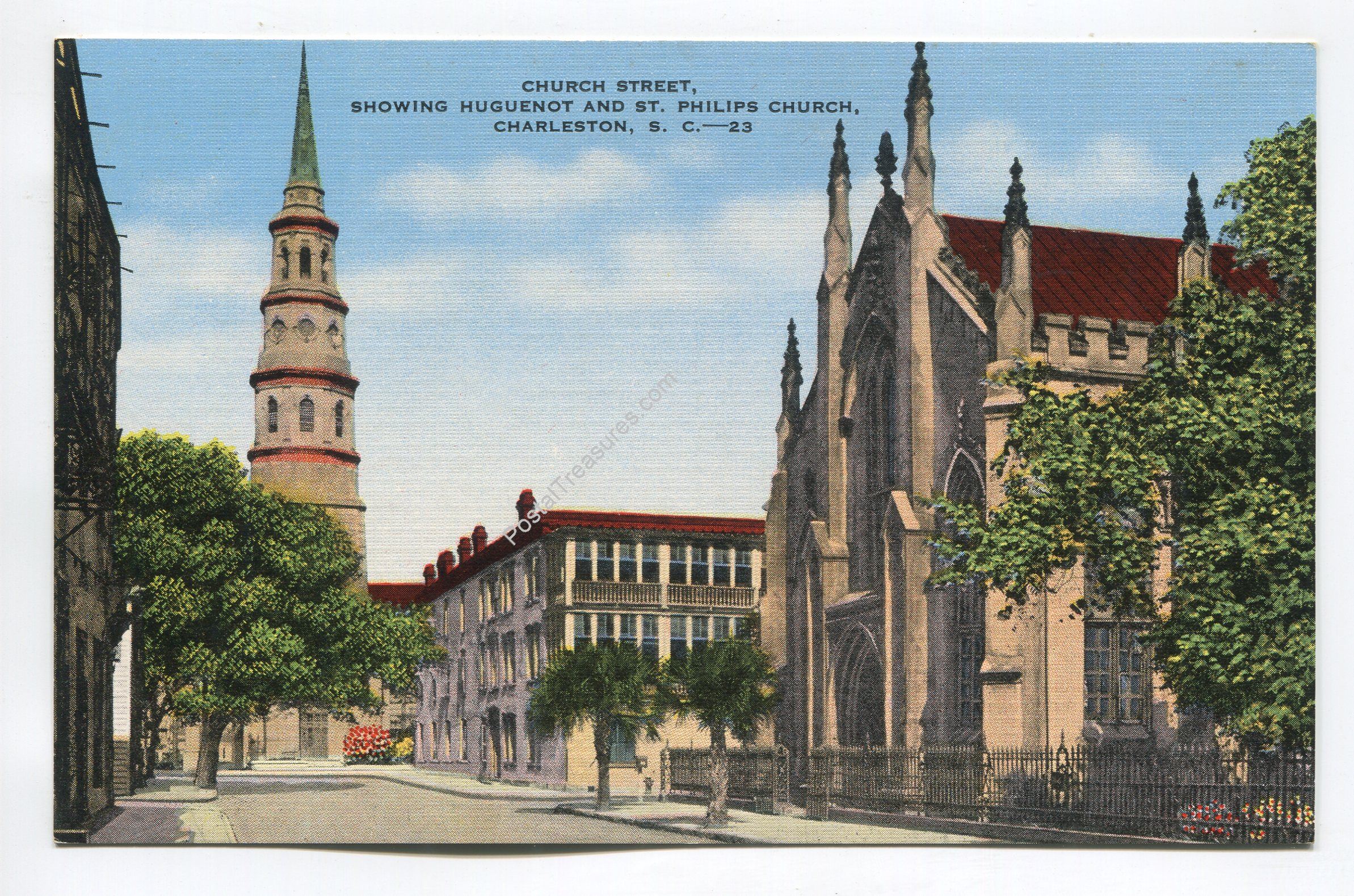 Church Street showing Huguenot and St Philips Church Charleston South Carolina postcard