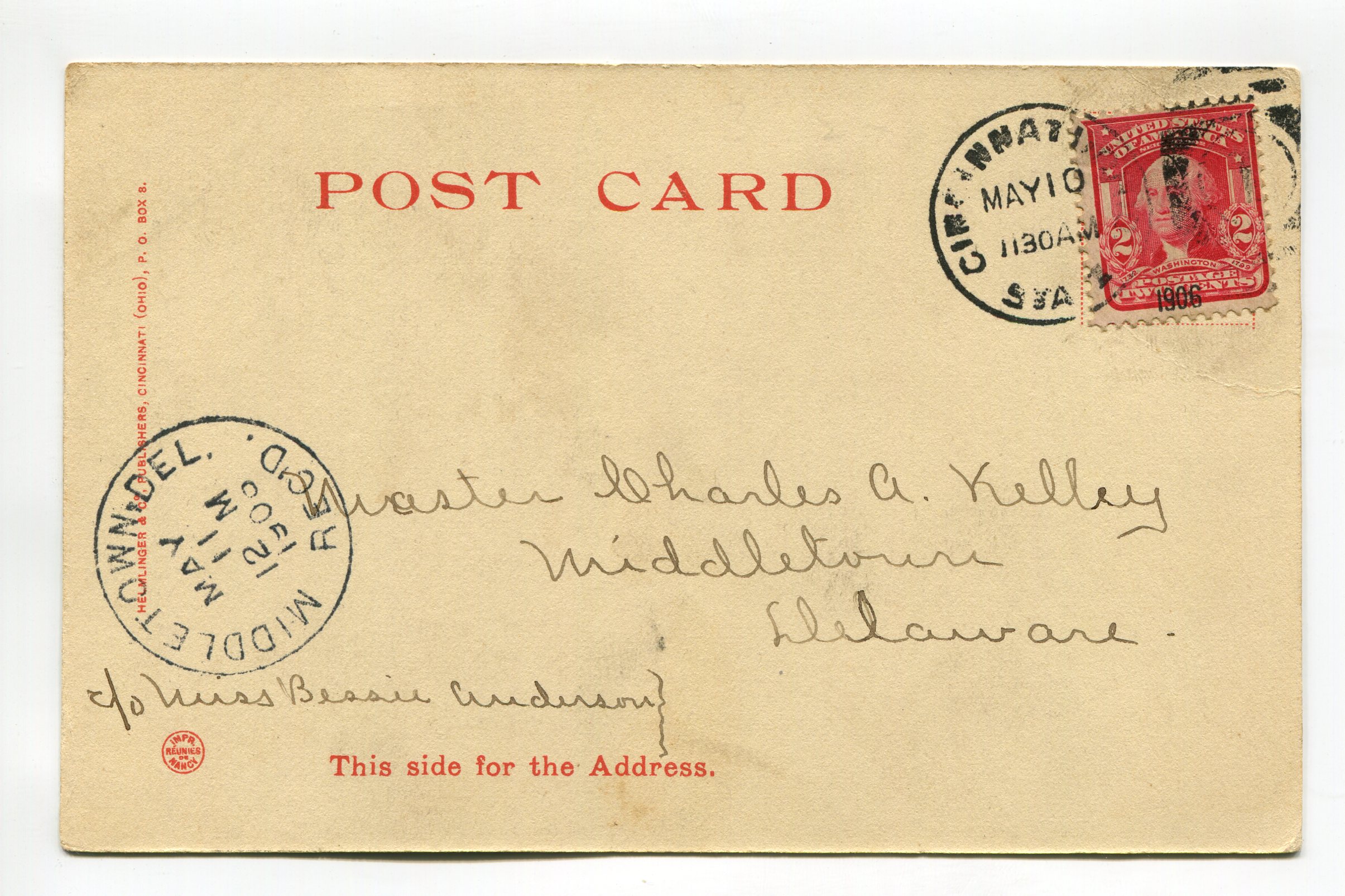 Condition – corner/edge wear, crease in top edge right of center, cancellation mark on front, album marks around corners, marks on card front, soiling/marks