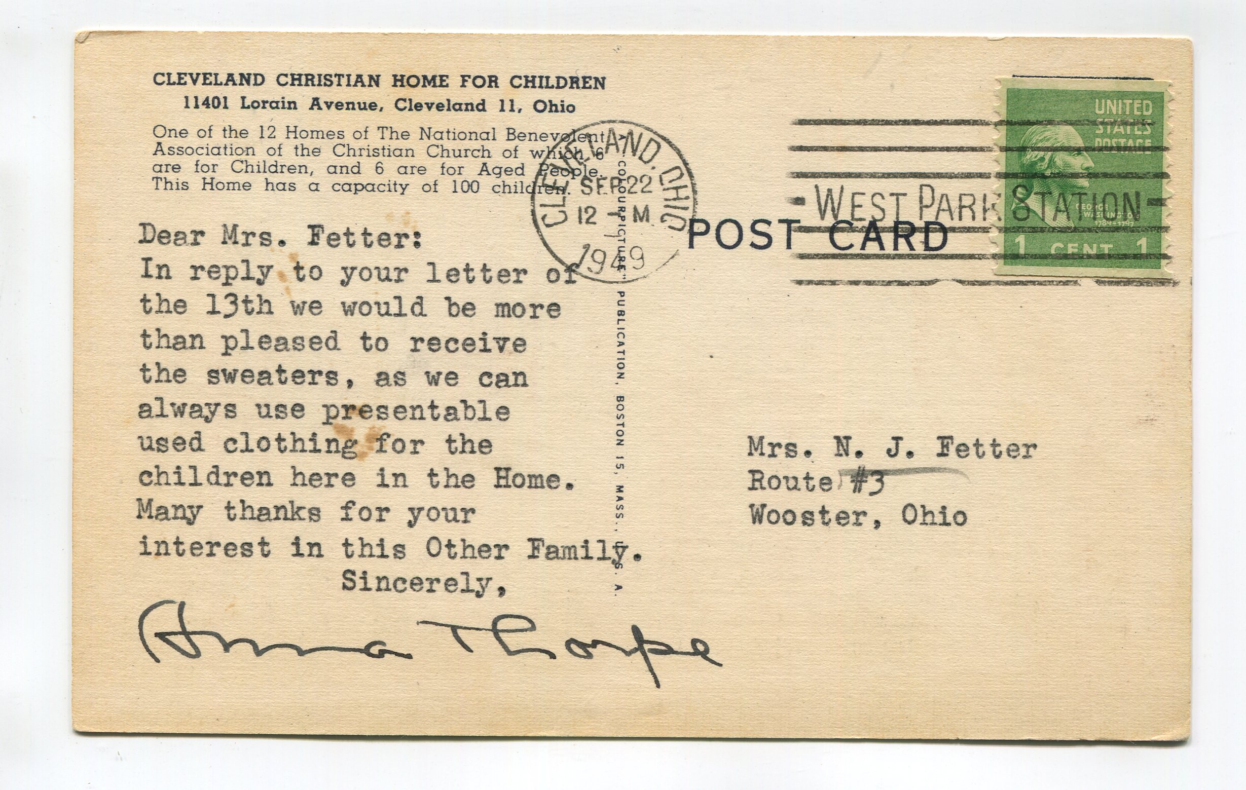Cleveland Christian Home for Children 11401 Lorain Avenue Cleveland 11 Ohio postcard