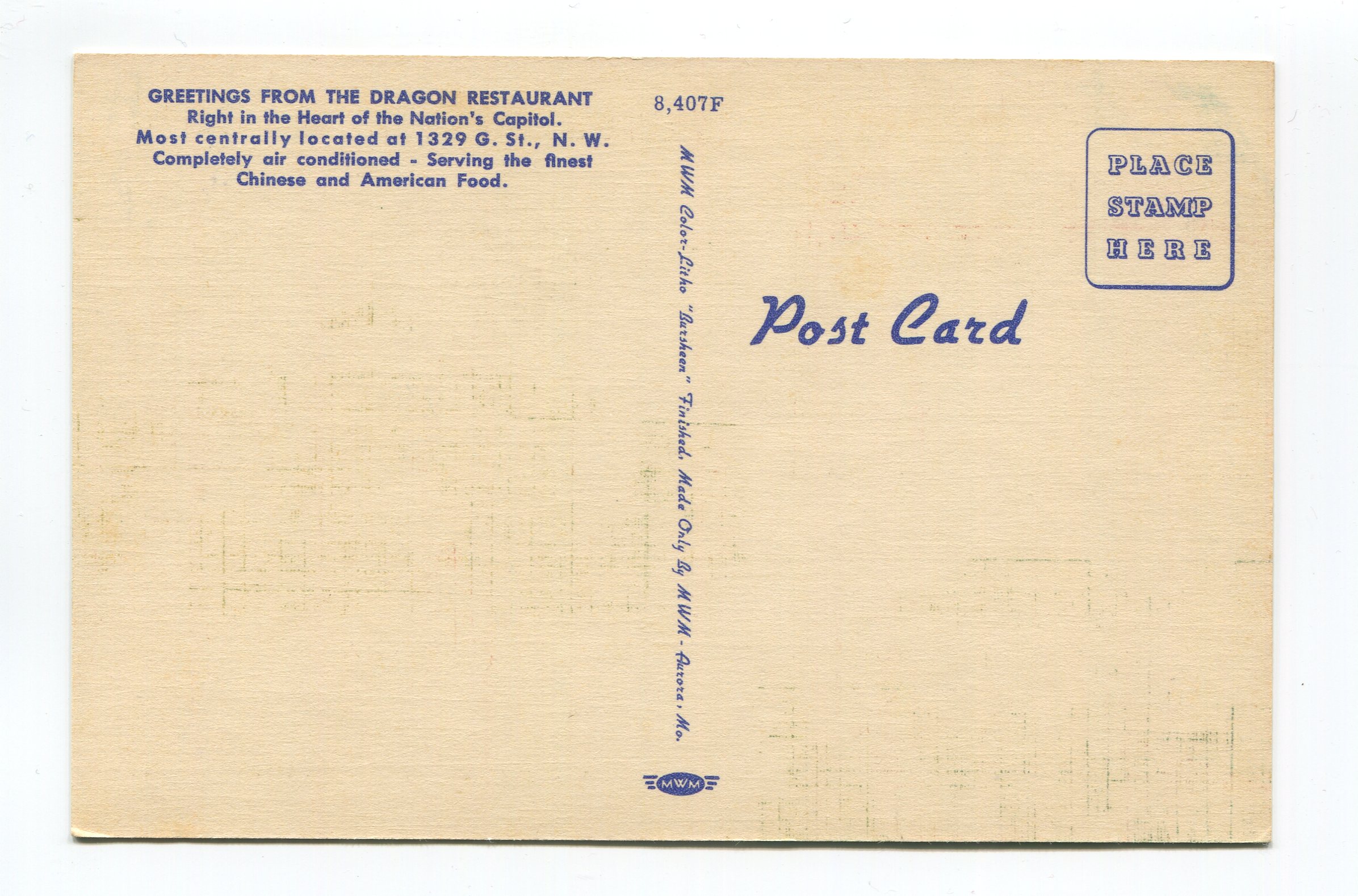 Dragon Restaurant 1329 G Street NW Washington DC postcard