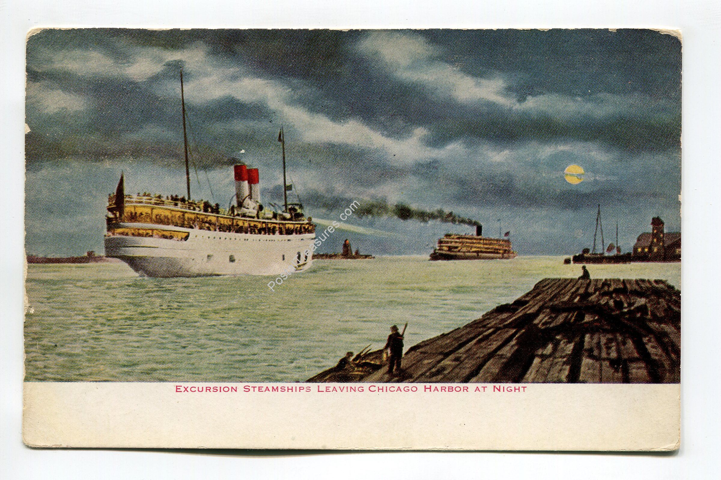 Excursion Steamships leaving Chicago Harbor at Night postcard