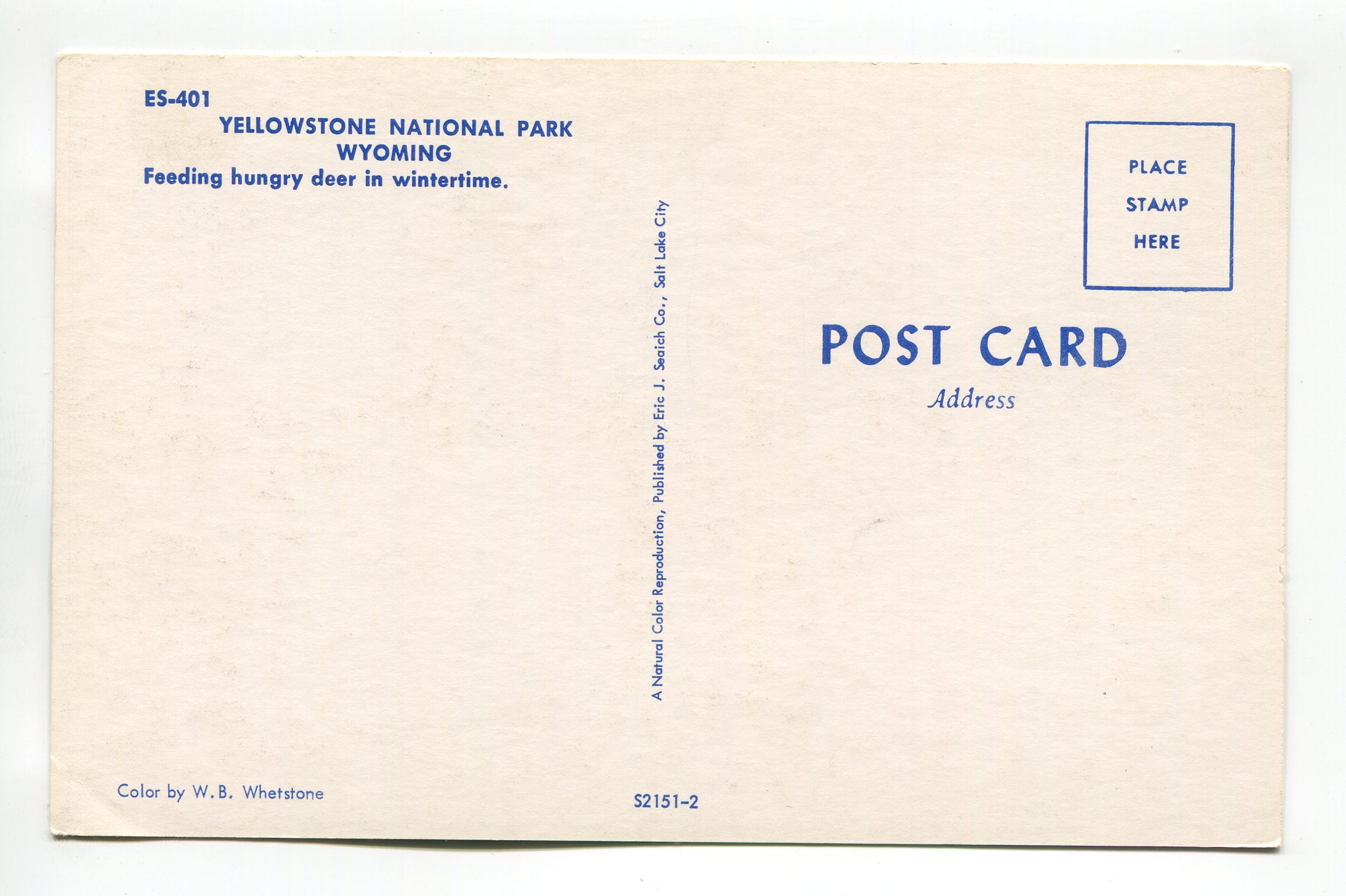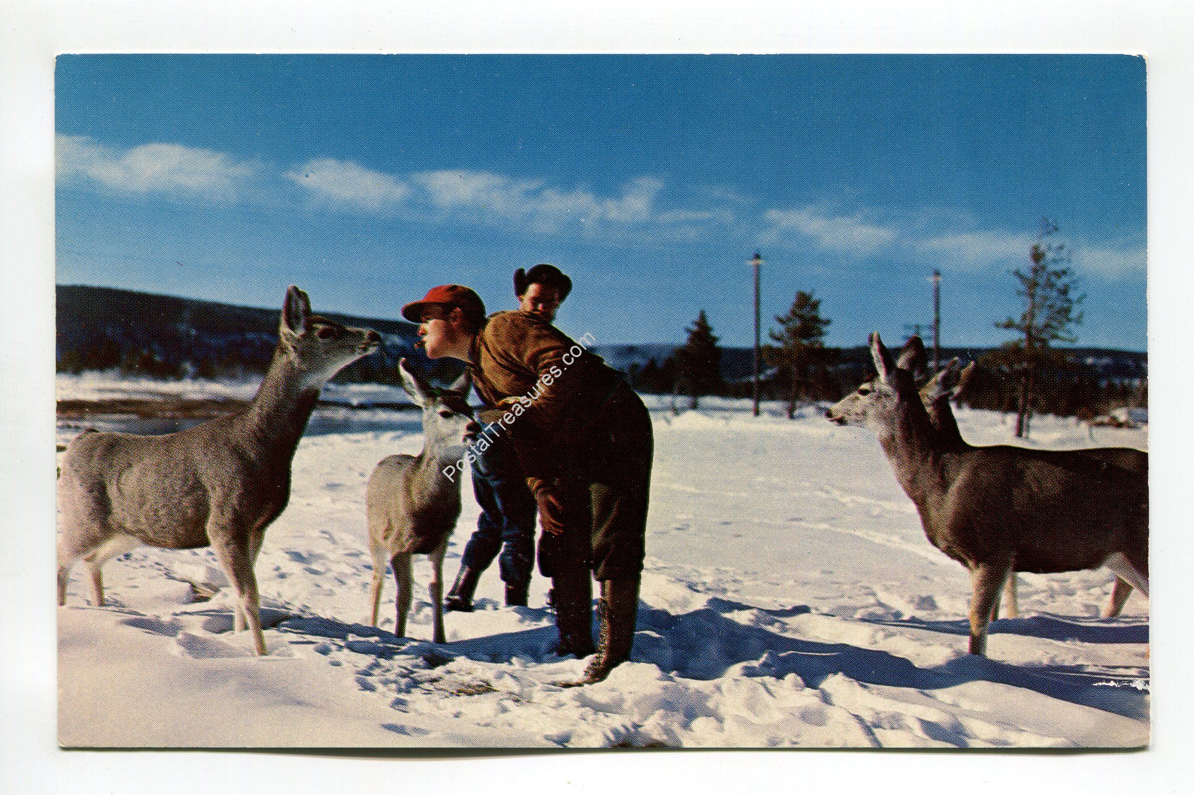 Feeding hungry deer in wintertime Yellowstone National Park Wyoming postcard