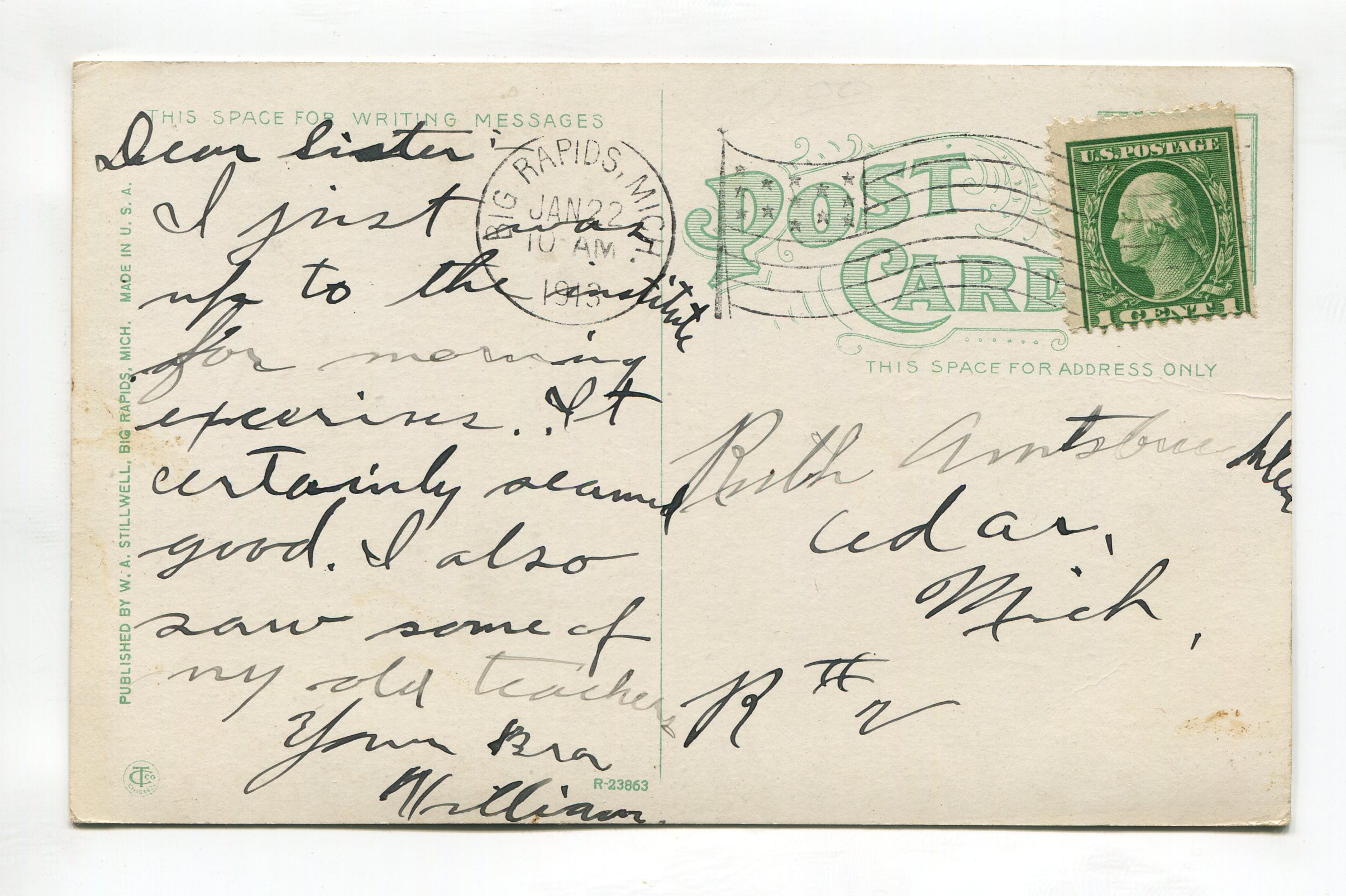 Condition – noticeable corner/edge wear, crease in corners and center of left edge, cancellation impression visible on card front, soiling/marks