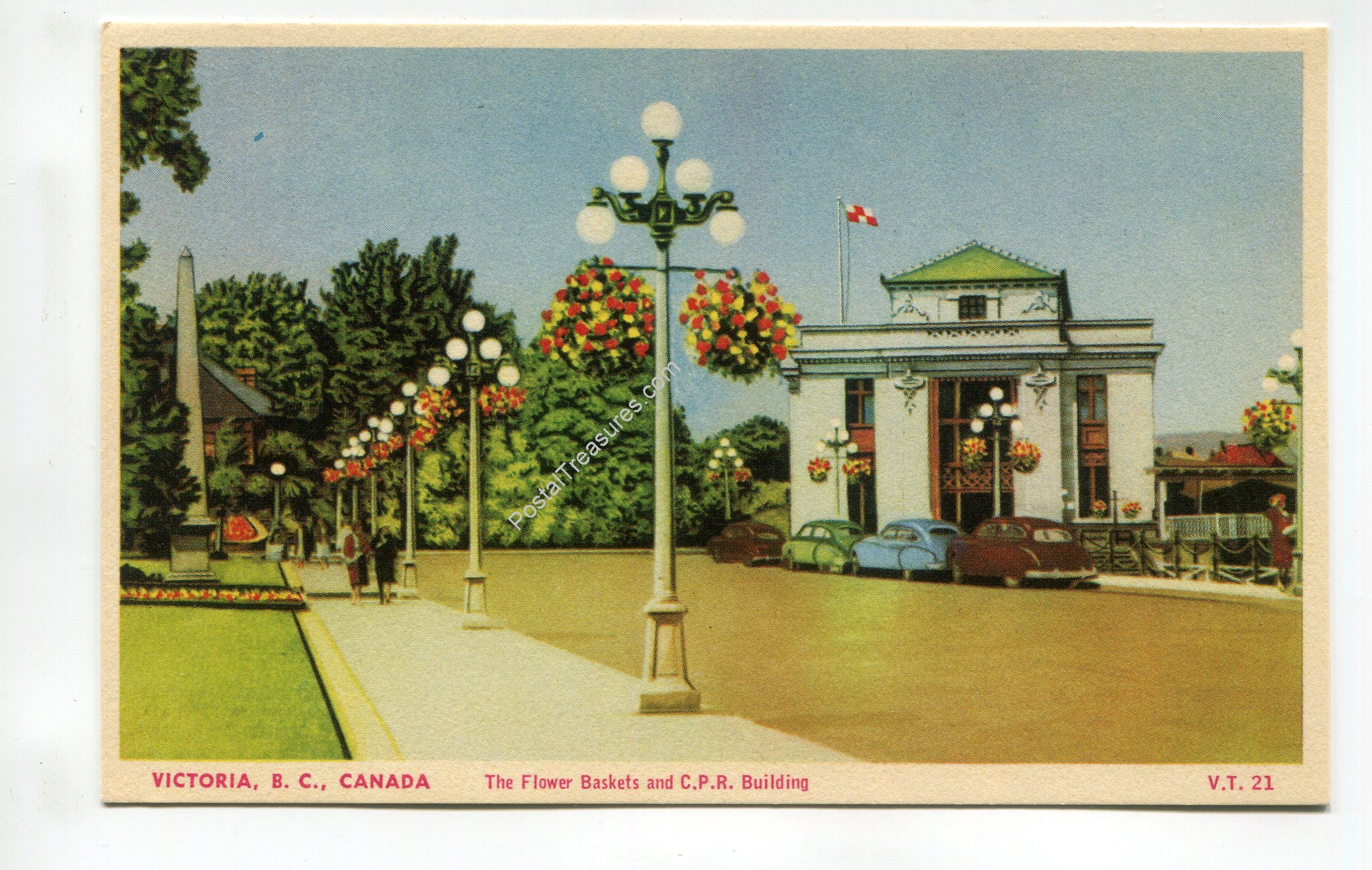 Flower Baskets and CPR Building Victoria British Columbia Canada postcard
