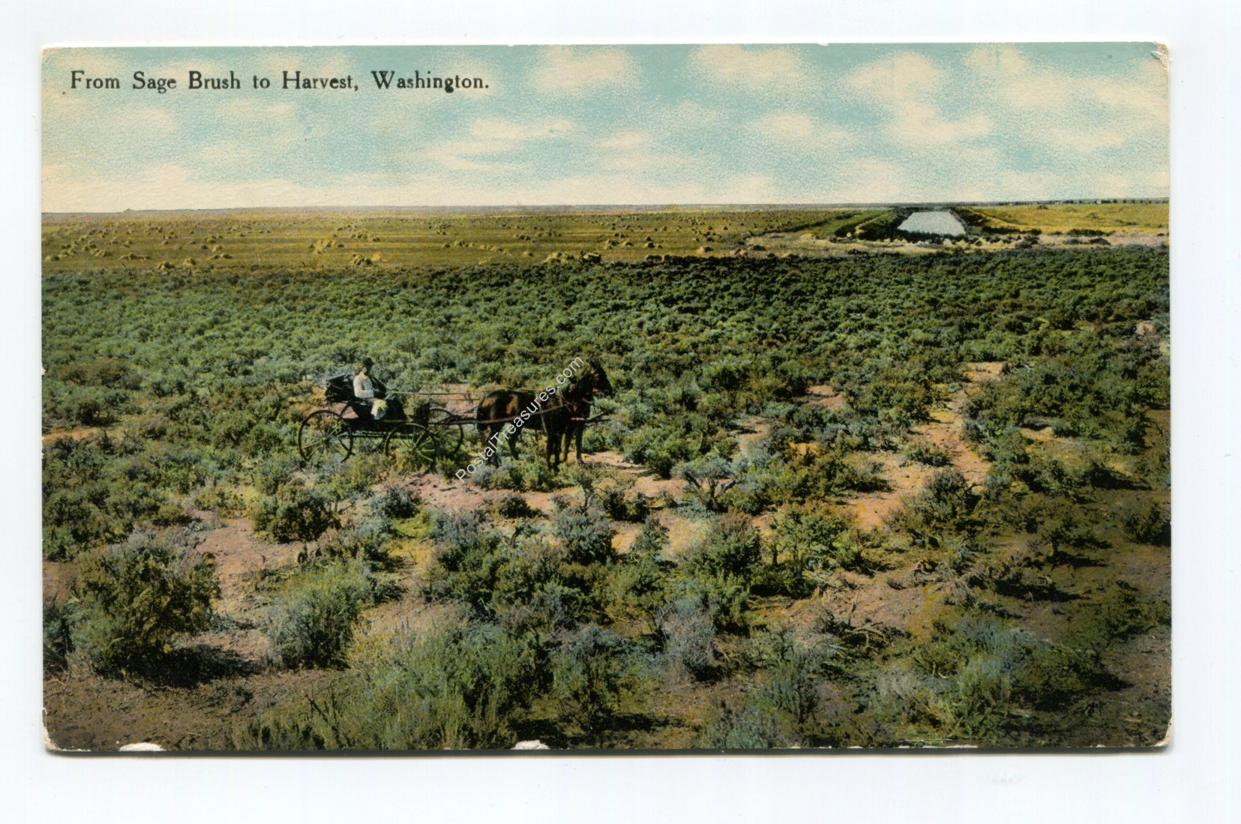 From Sage Brush to Harvest Washington – person in horse drawn buggy postcard