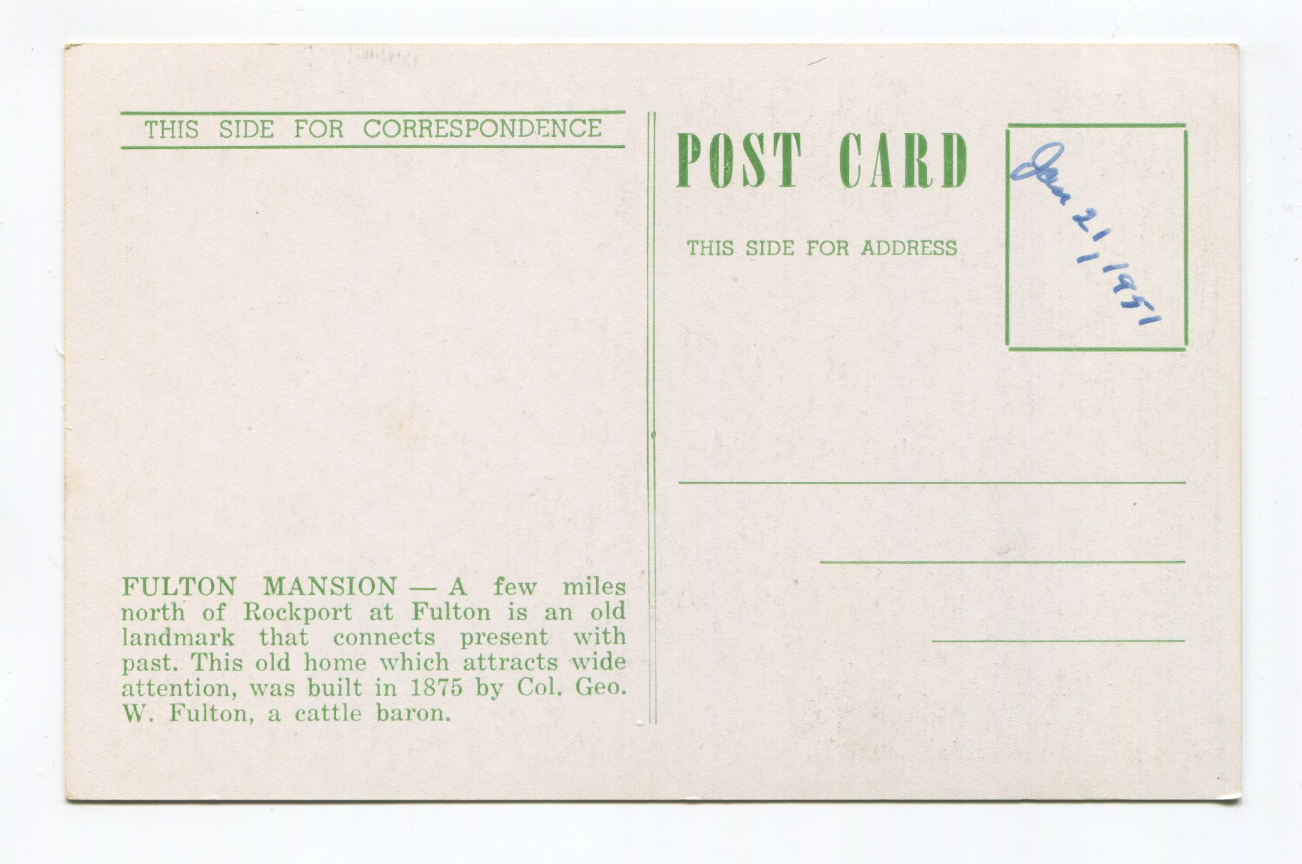 Fulton Mansion – A few miles north of Rockport – built 1875 postcard