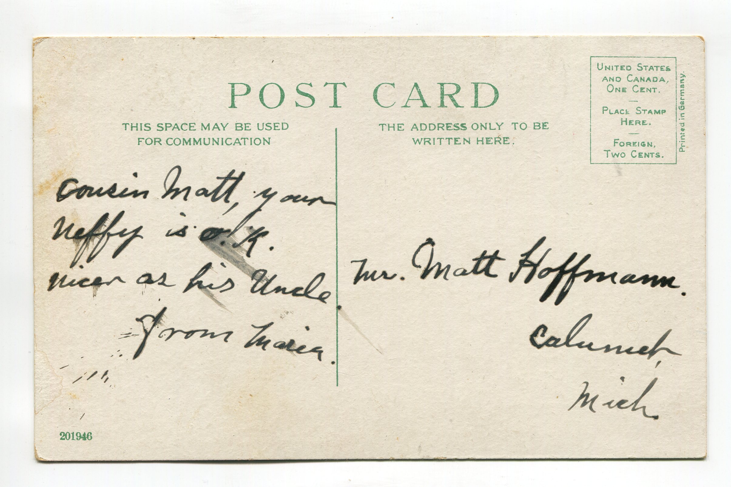 Condition – corner/edge wear, residue/mark upper left of card center, marks on card front, album impression marks around corners, soiling/marks