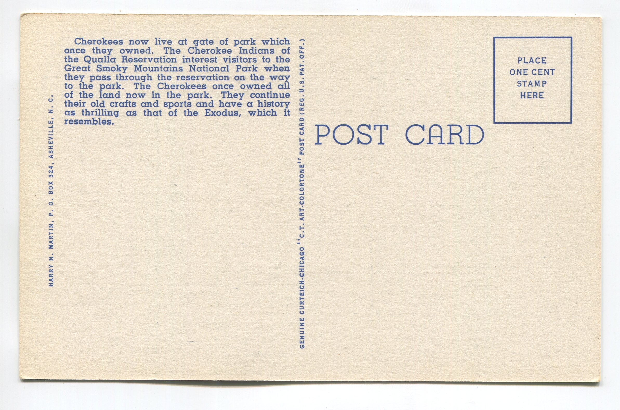 Greetings from Cherokee Indian Reservation Adjoining Great Smoky Mountains National Park postcard