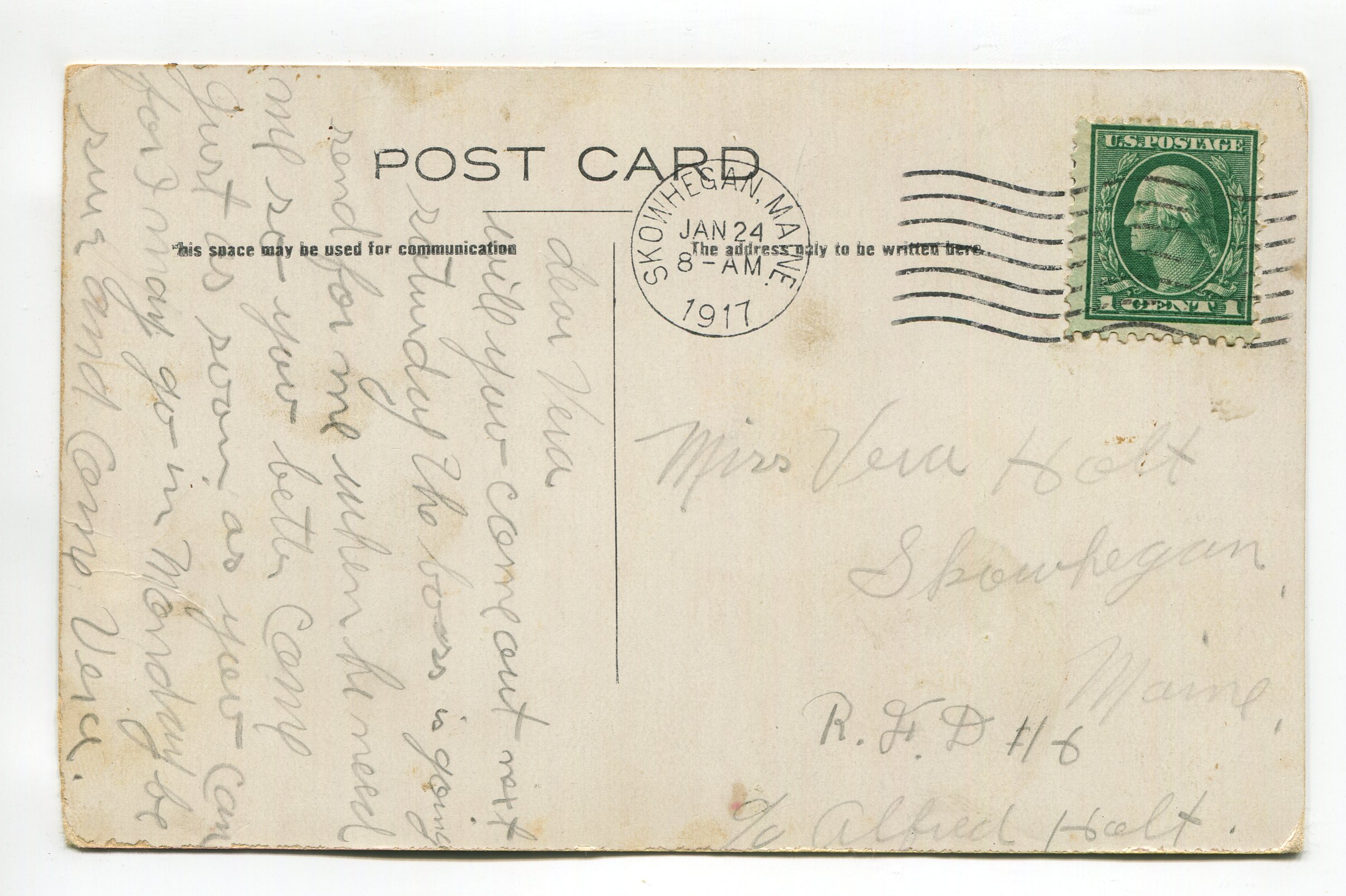 Condition – noticeable corner/edge wear, crease in corners and in top edge right of center, rear message impression visible on card front, marks on card front, soiling/marks