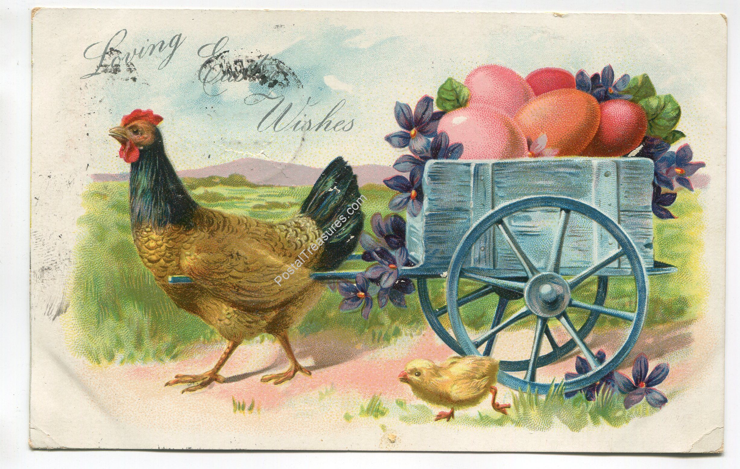 Hen pulling cart of eggs Loving Easter Wishes postcard