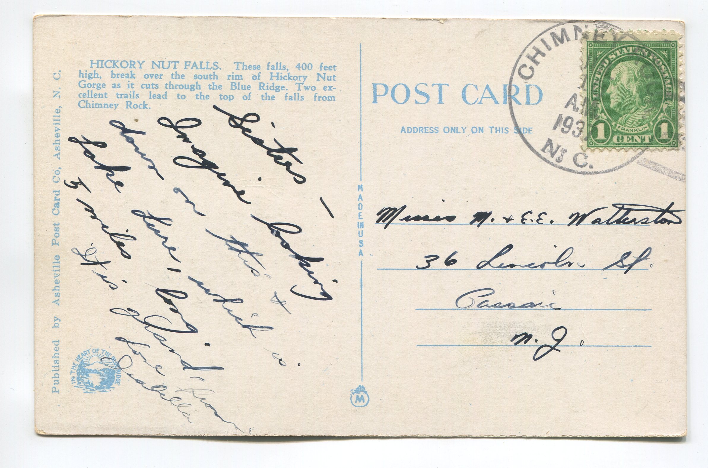 Hickory Nut Falls in the Chimney Rock Section Western North Carolina postcard