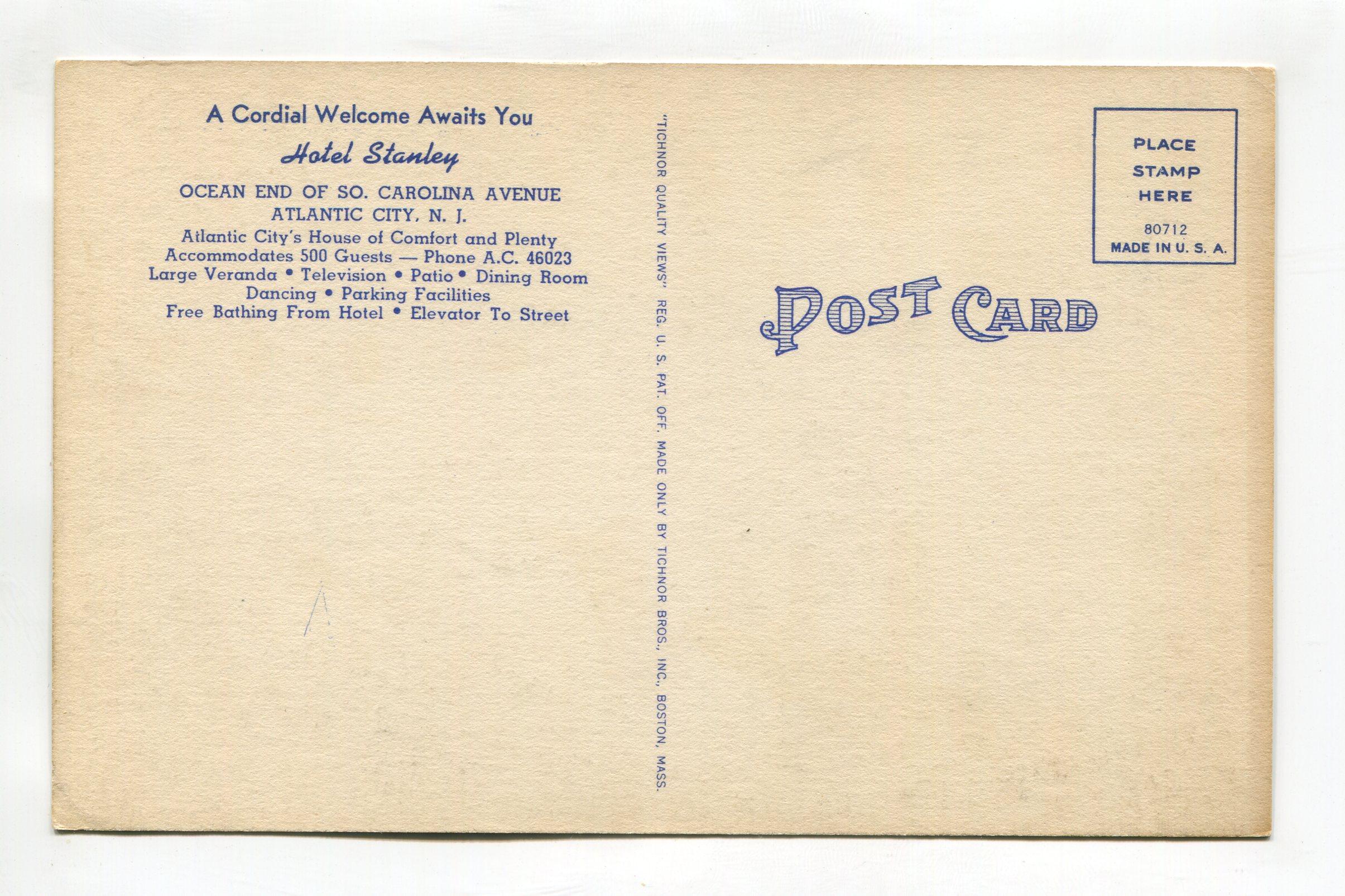 Hotel Stanley Ocean End of South Carolina Avenue Atlantic City New Jersey postcard