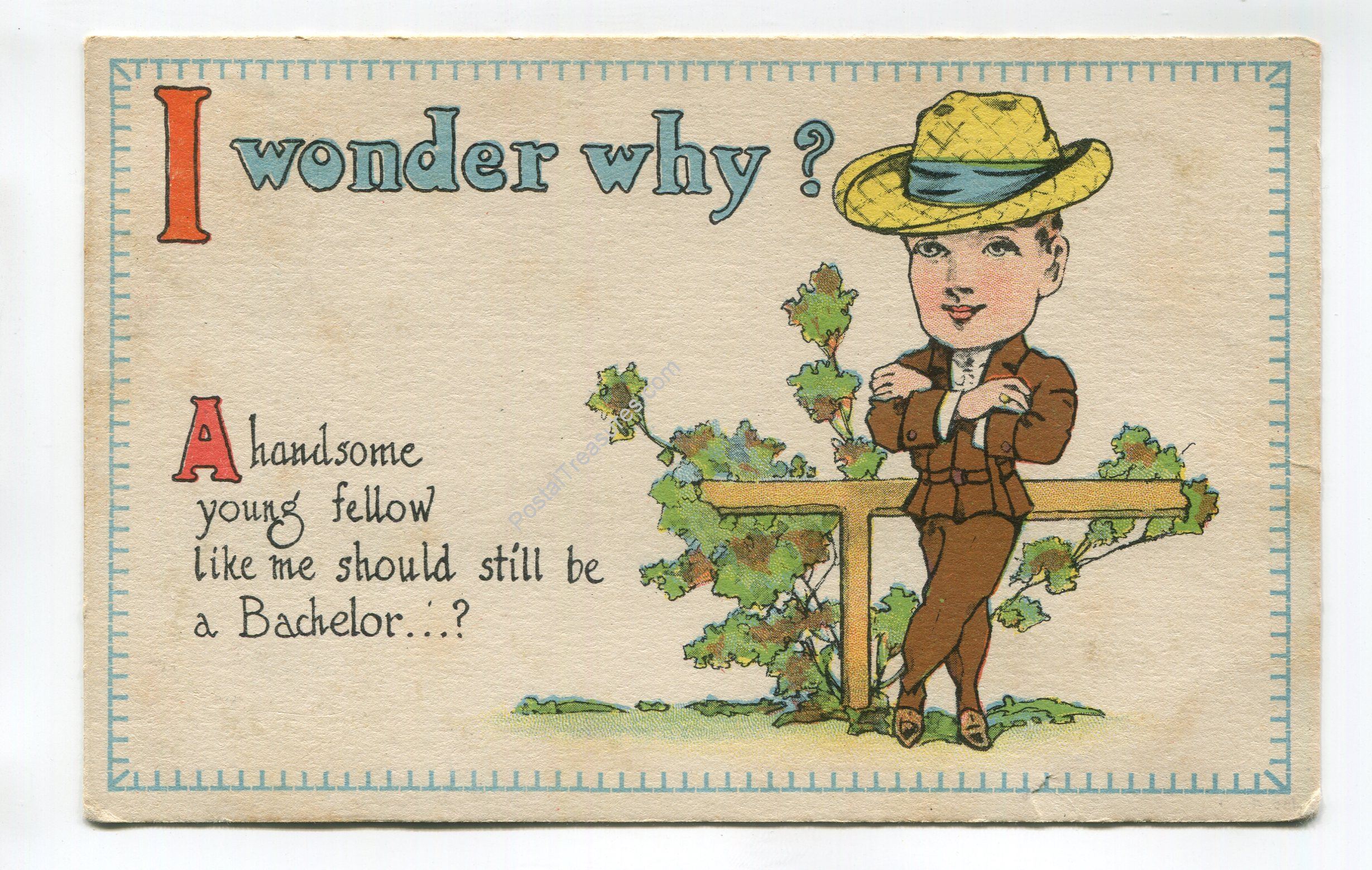 I wonder why? A handsome young fellow like me should still be a Bachelor…? postcard