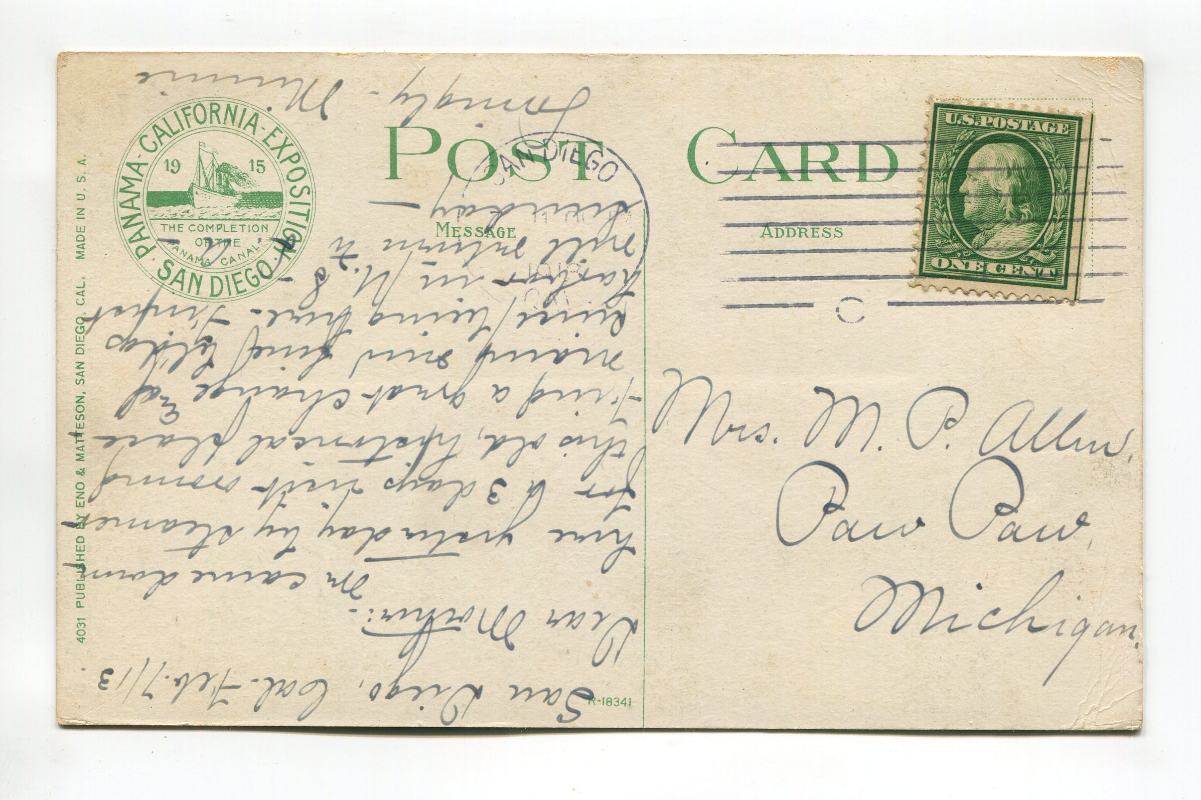 Condition – noticeable corner/edge wear, crease in corners, indentation mark in left edge below center, writing on card rear, cancellation marks on card front, album impression marks around corners, soiling/marks