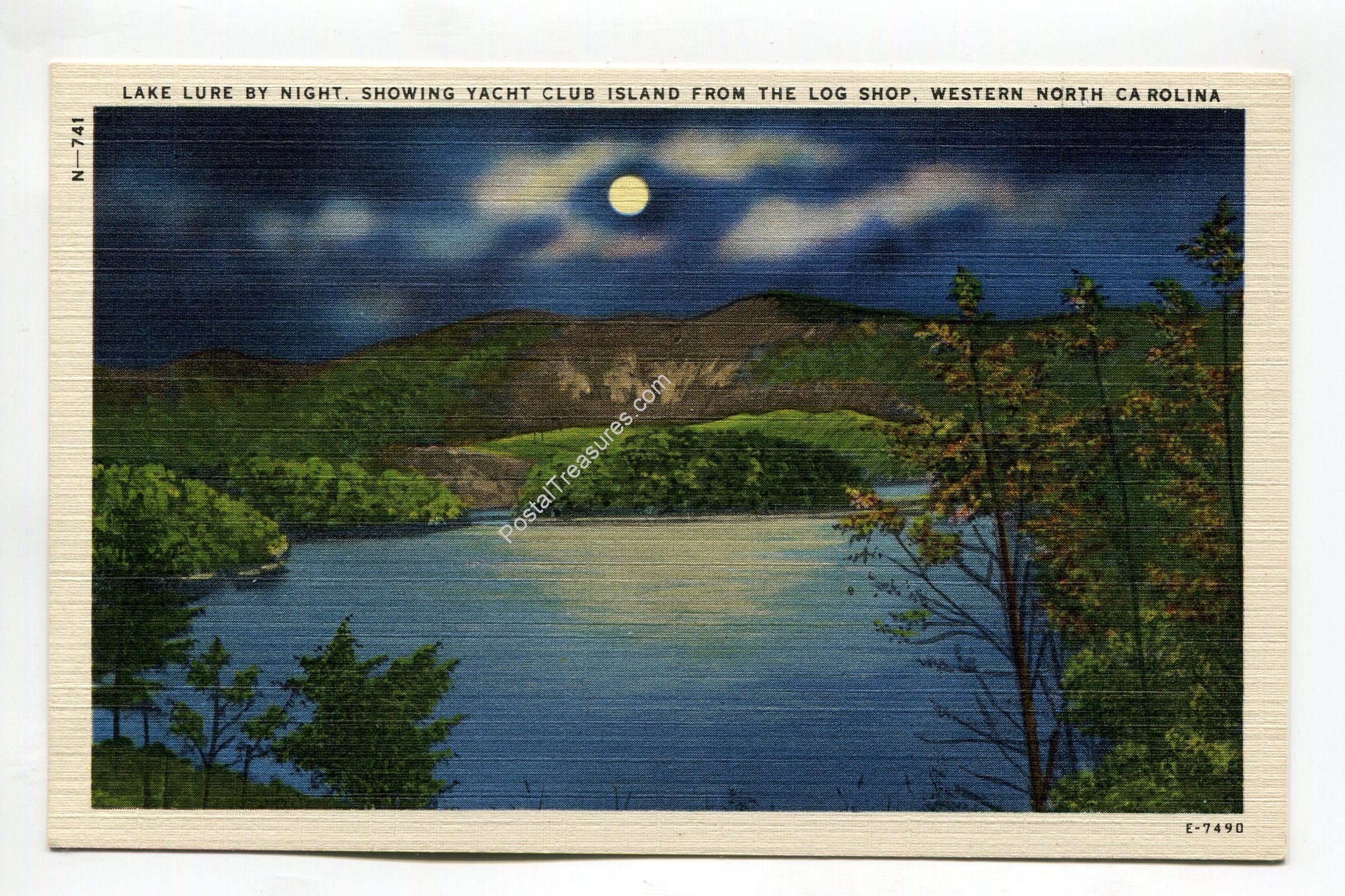 Lake Lure by Night showing Yacht Club Island from the Log Shop Western North Carolina postcard