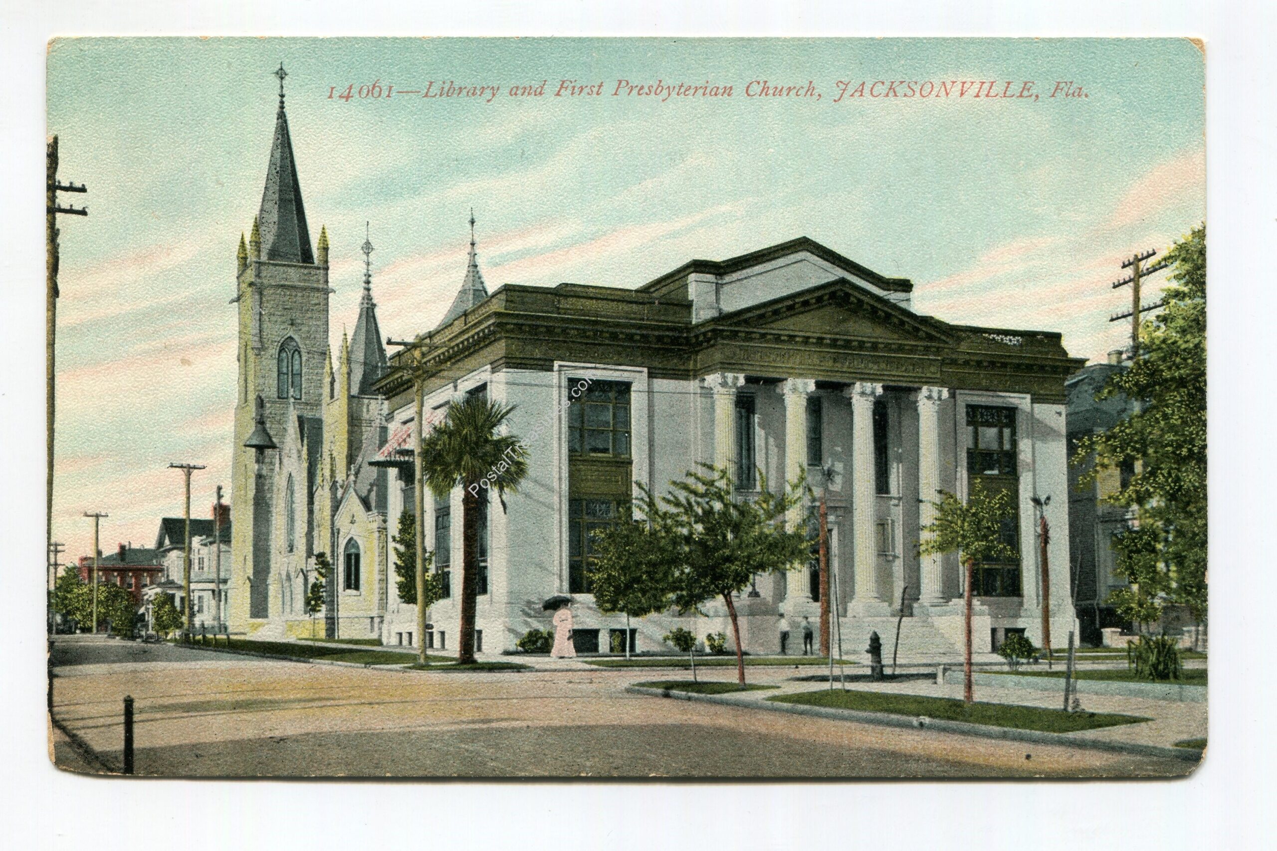Library and First Presbyterian Church Jacksonville Florida postcard