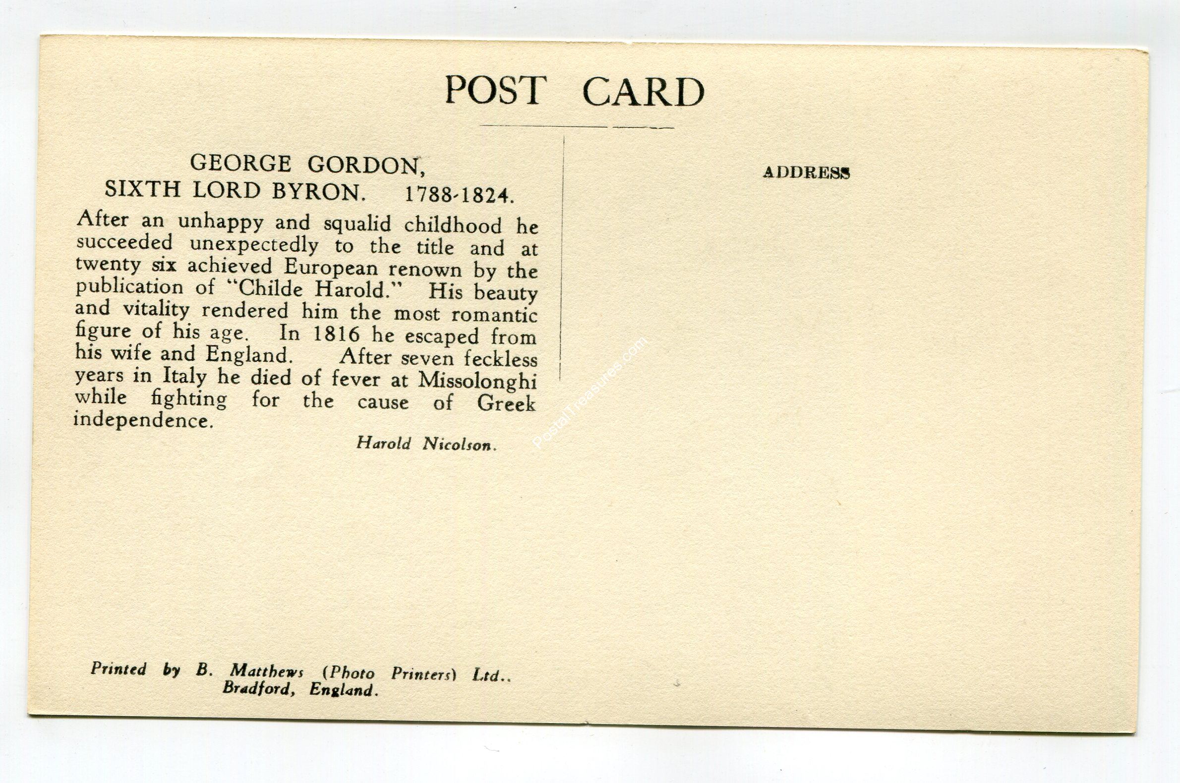Lord Byron painting by or after Richard Westall R.A. postcard