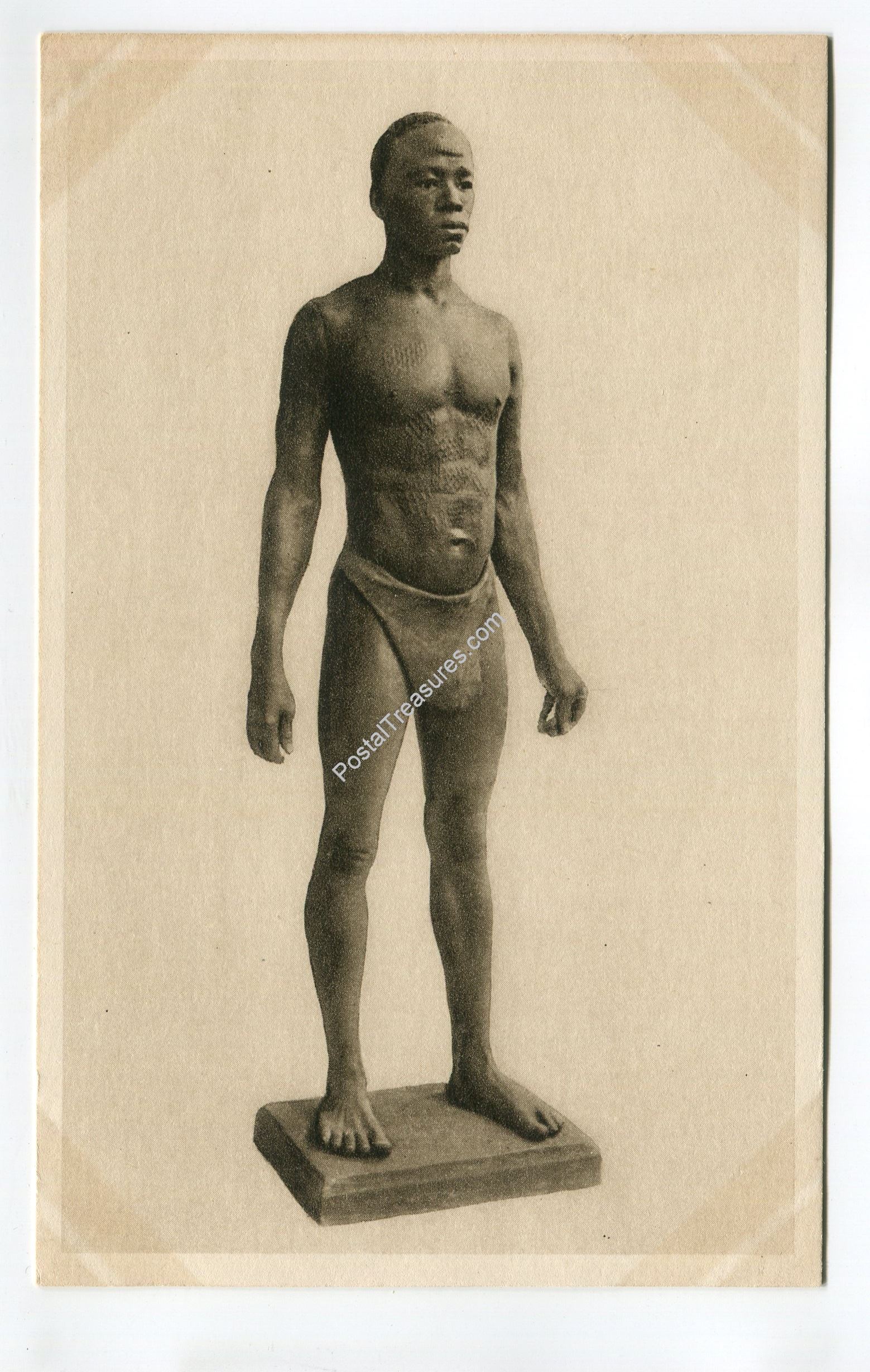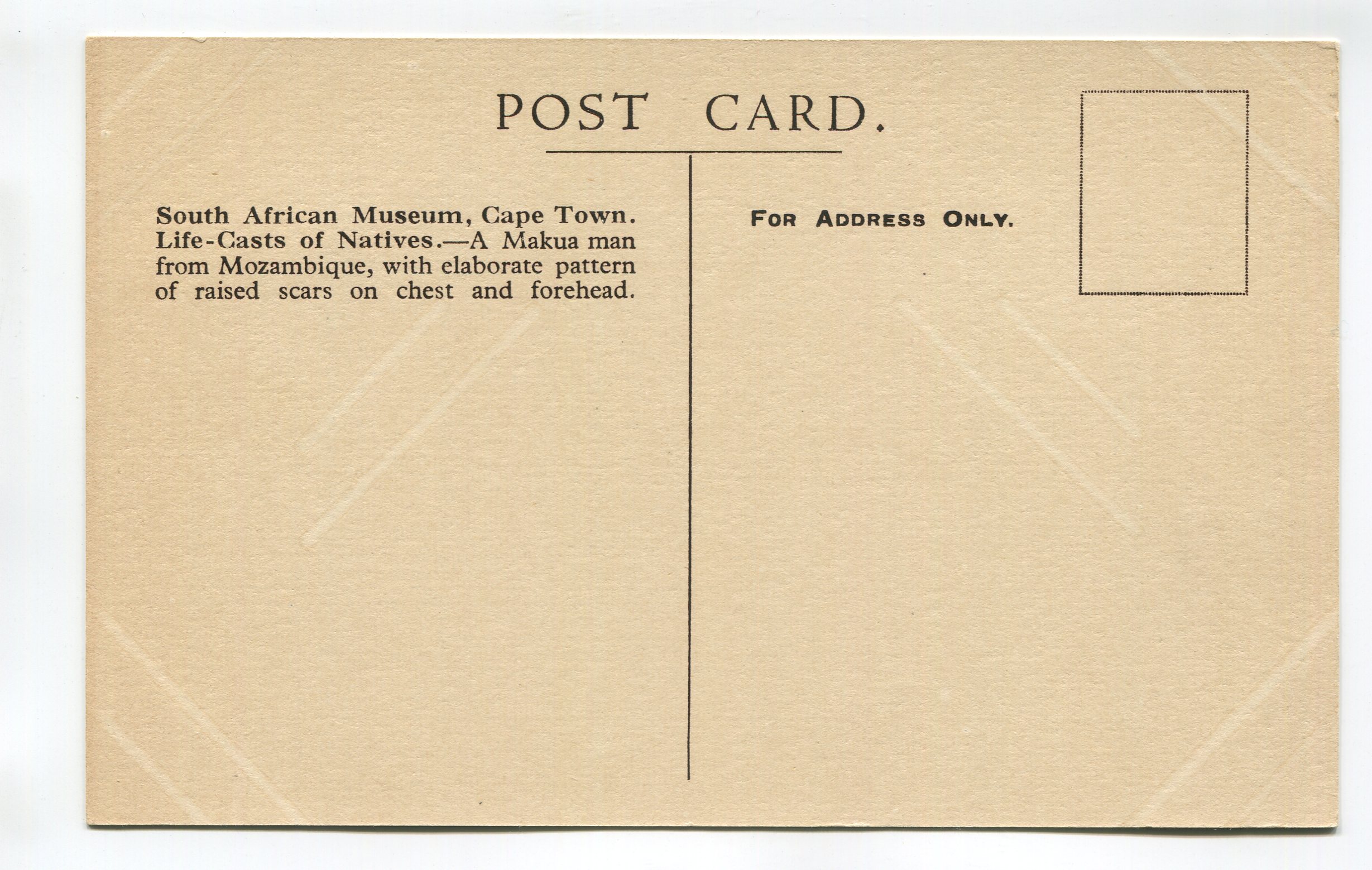 Life-Casts of Natives – A Makau man from Mozambique, with elaborate pattern of raised scars on chest and forehead. South African Museum, Cape Town postcard