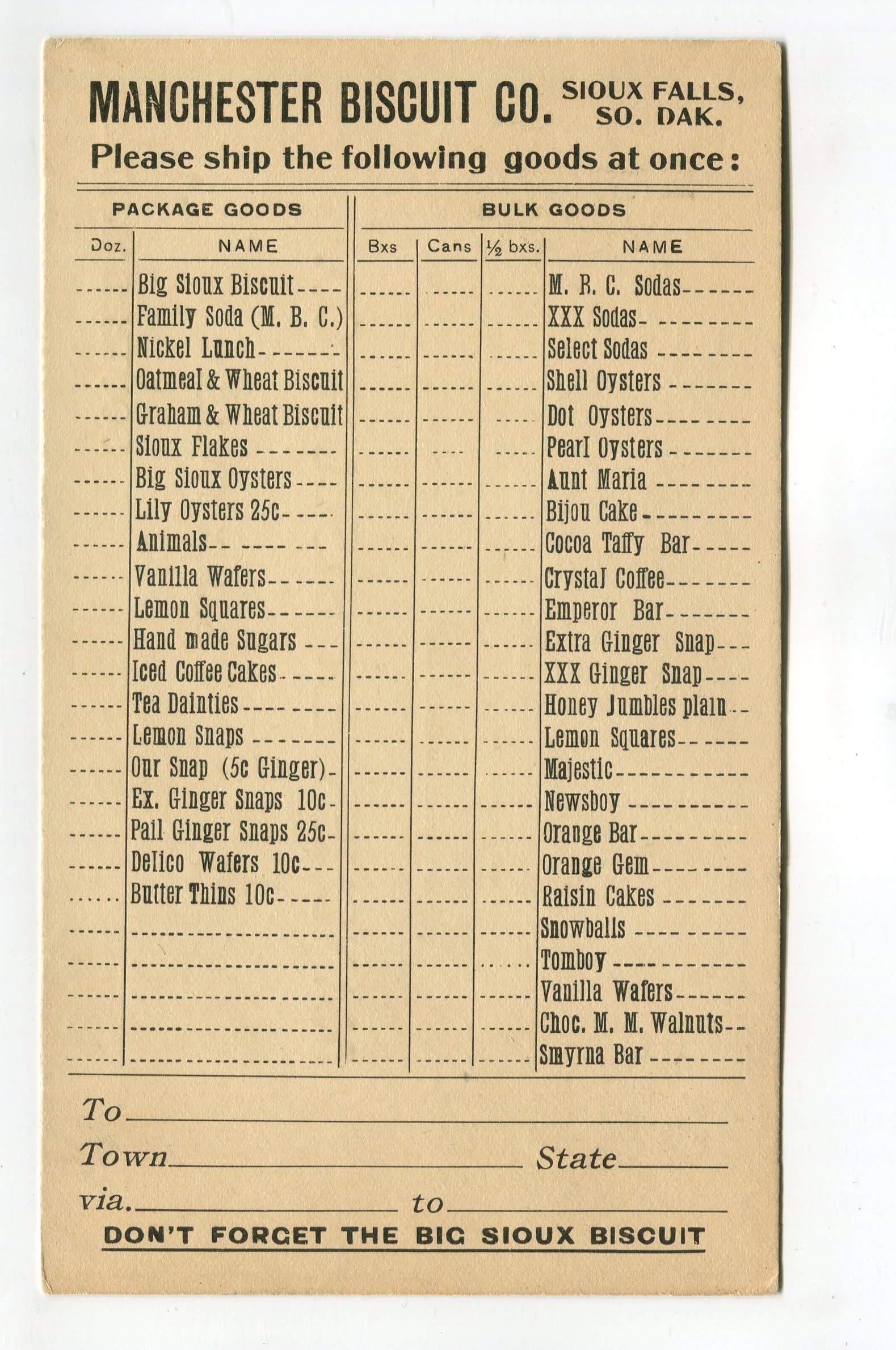 Manchester Biscuit Co Sioux Falls South Dakota Order postcard