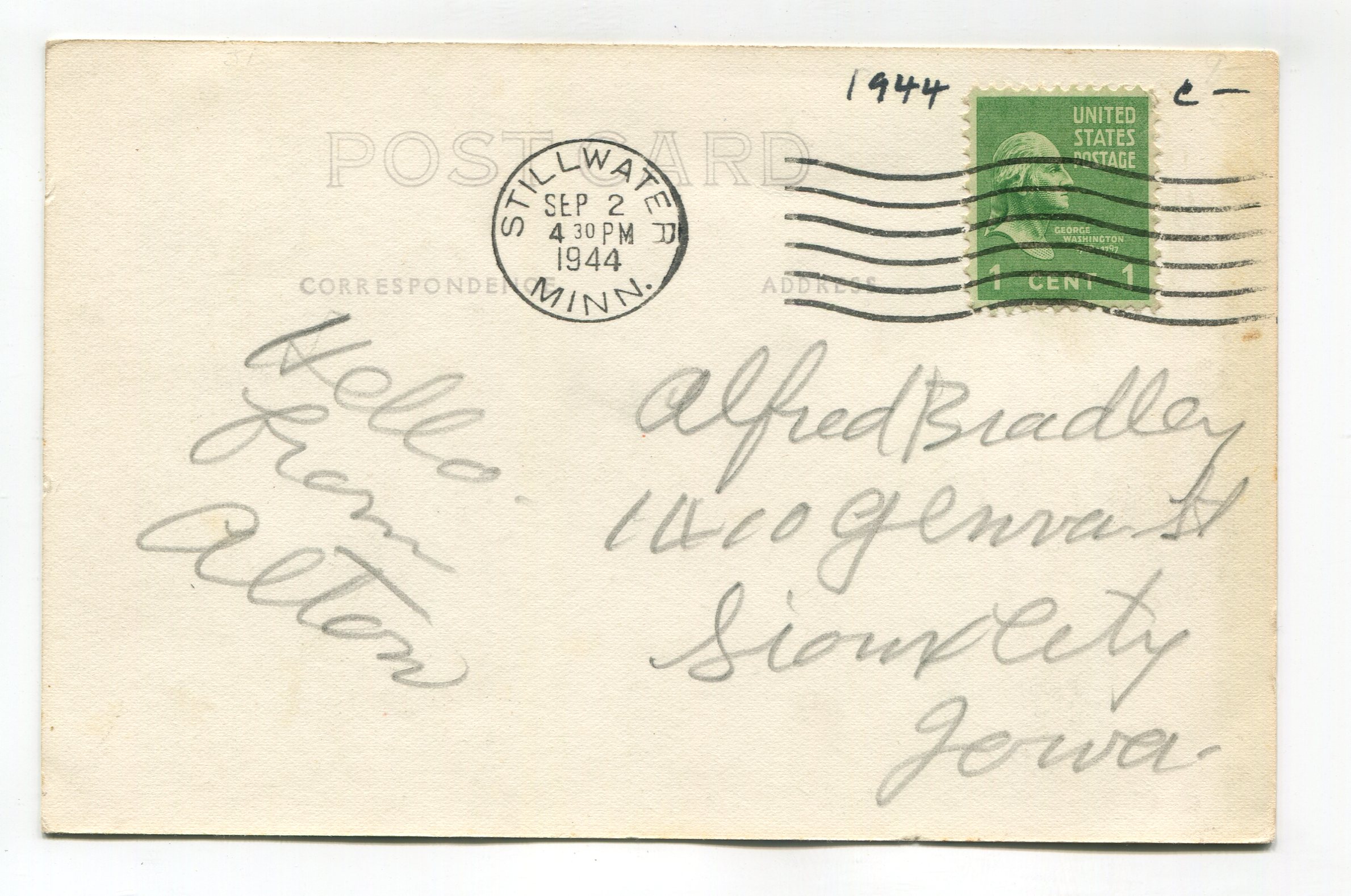 Condition – noticeable corner/edge wear, crease in corners and below top edge left of center, crease near lower left corner, cancellation impression visible on card front, marks on card front, soiling/marks