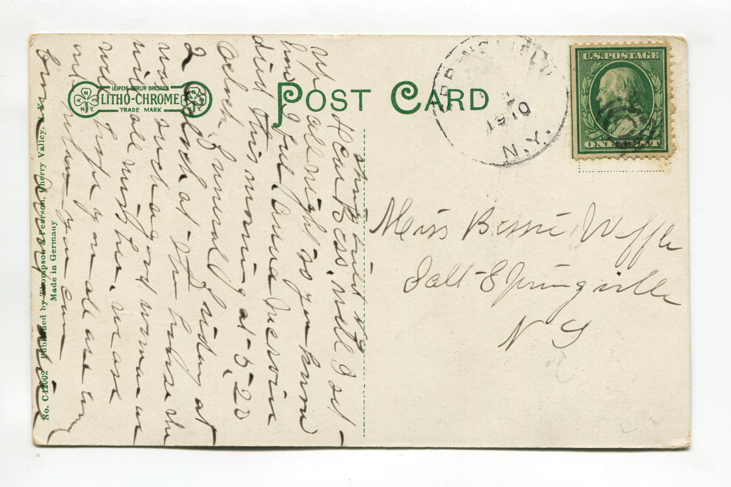 Condition – noticeable corner/edge wear, cancellation impression visible on card front, diagonal impression/crease mark lower right of card center, soiling/marks