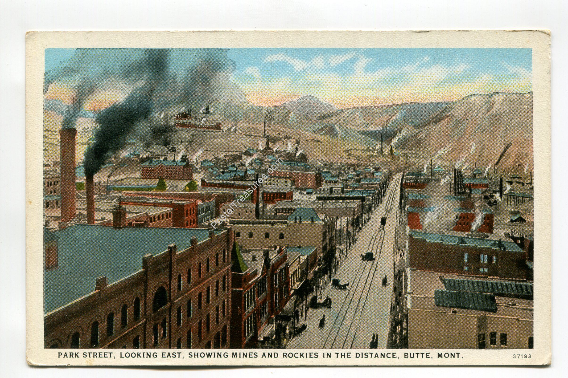 Park Street looking East showing mines and Rockies in the distance Butte Montana postcard