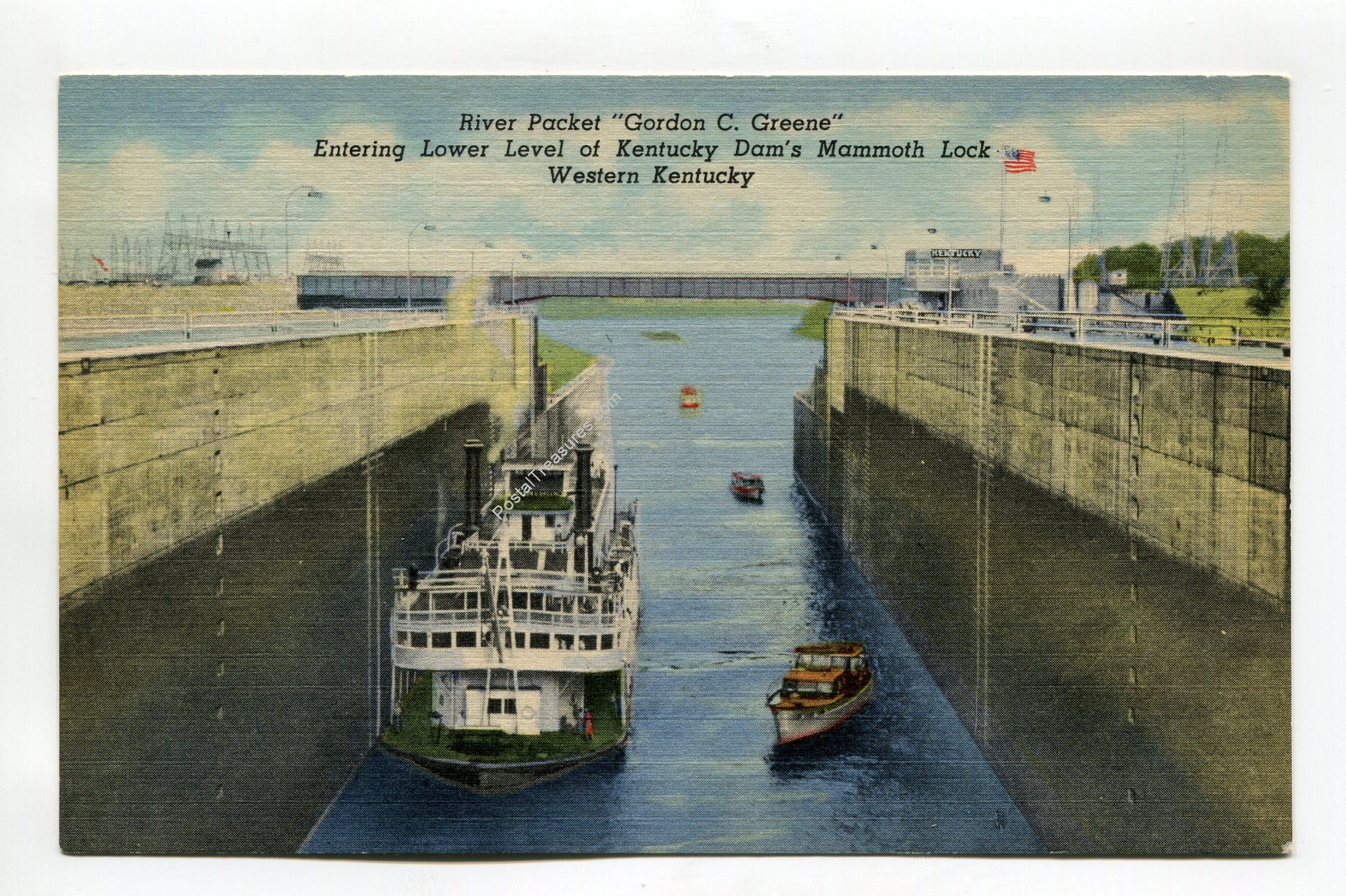 River Packet Gordon C Greene entering lower level of Kentucky Dam’s Mammoth Lock Western Kentucky postcard