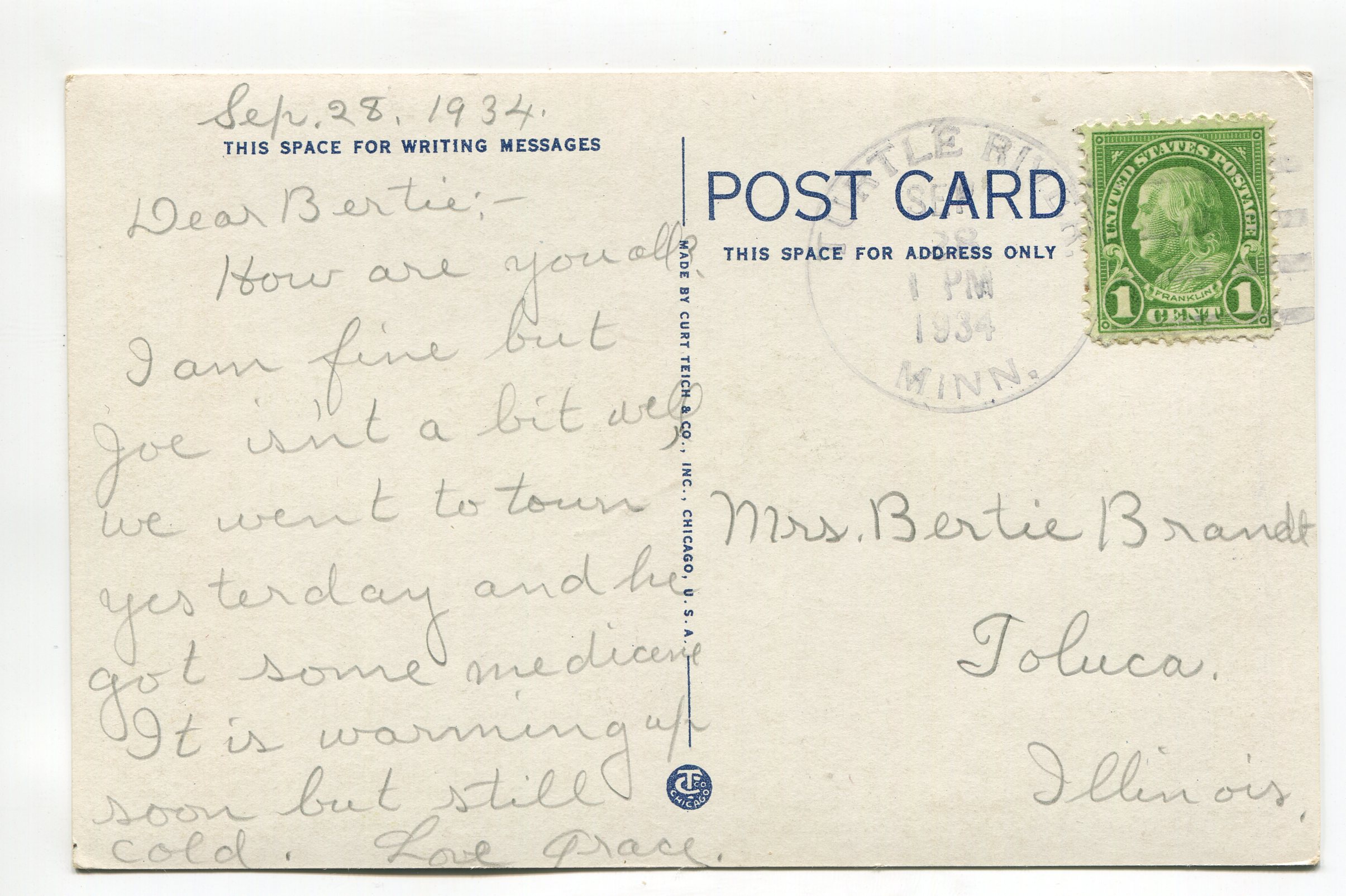 Condition – corner/edge wear, creases in top left corner, rear message impression visible on card front, soiling/marks