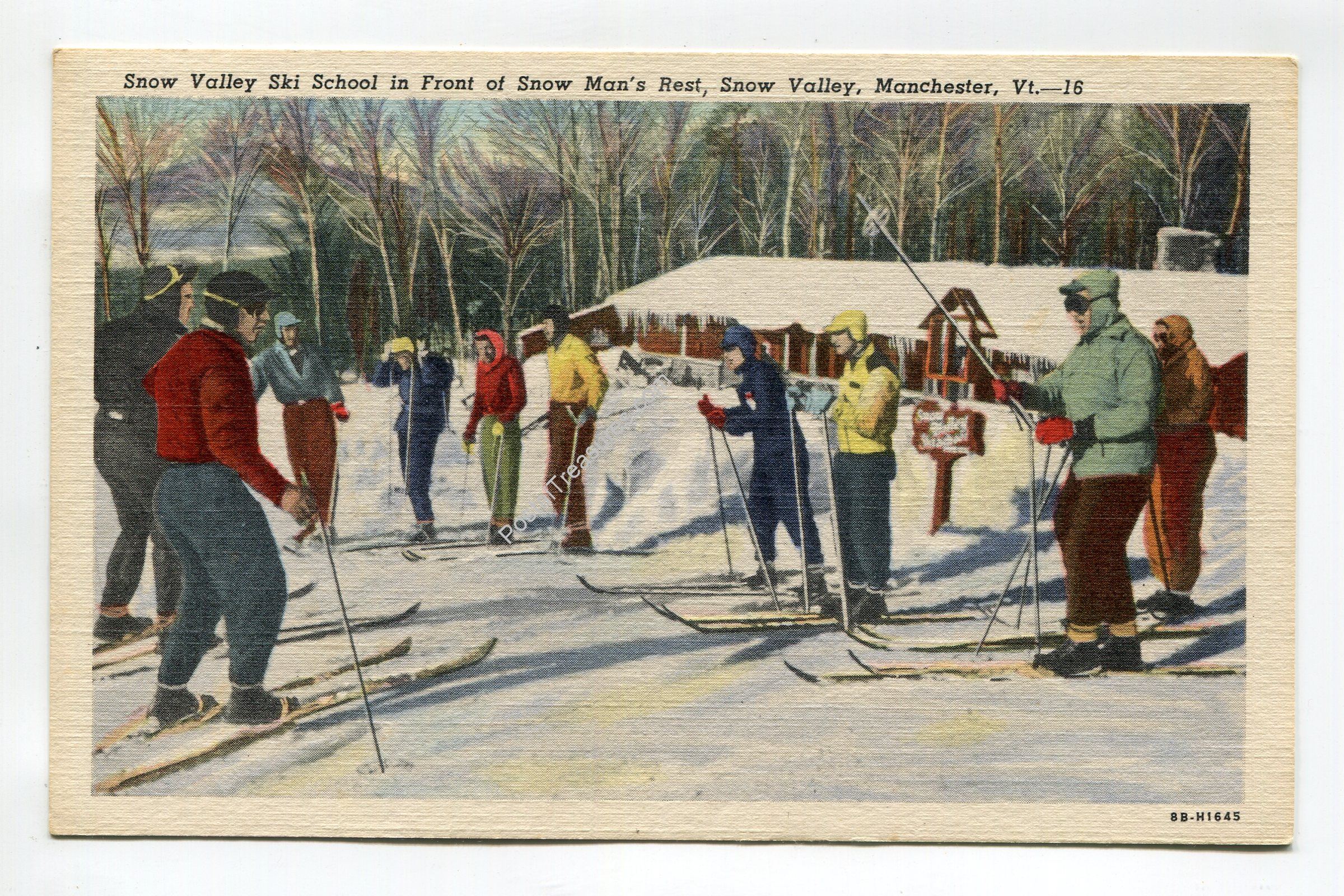 Snow Valley Ski School in Front of Snow Mans Rest Snow Valley Manchester Vermont postcard