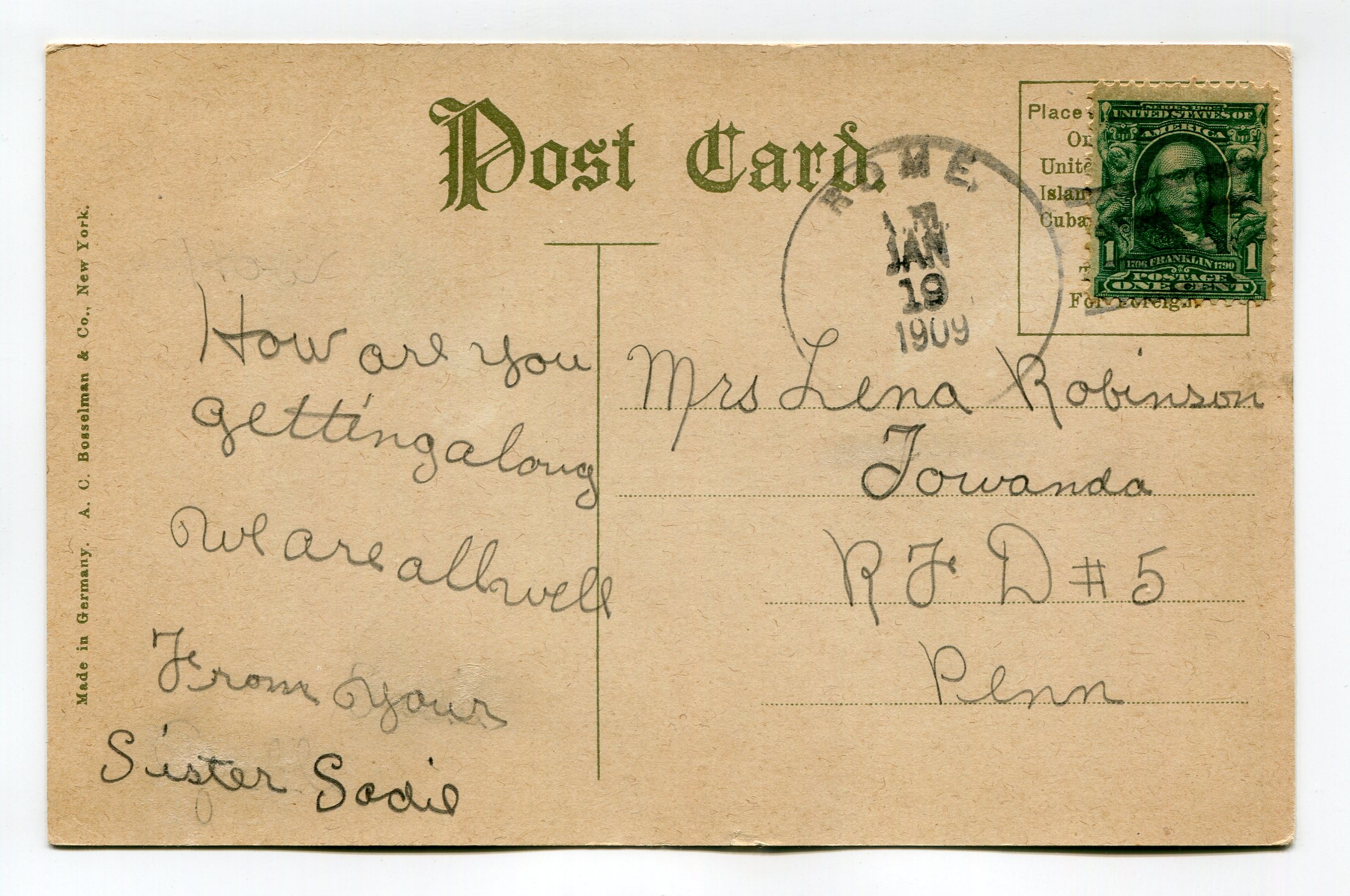 Condition – noticeable corner/edge wear, crease in corners and near lower right edge, rear written message impression clearly visible on card front, tear in center of left edge, marks on card front, soiling/marks