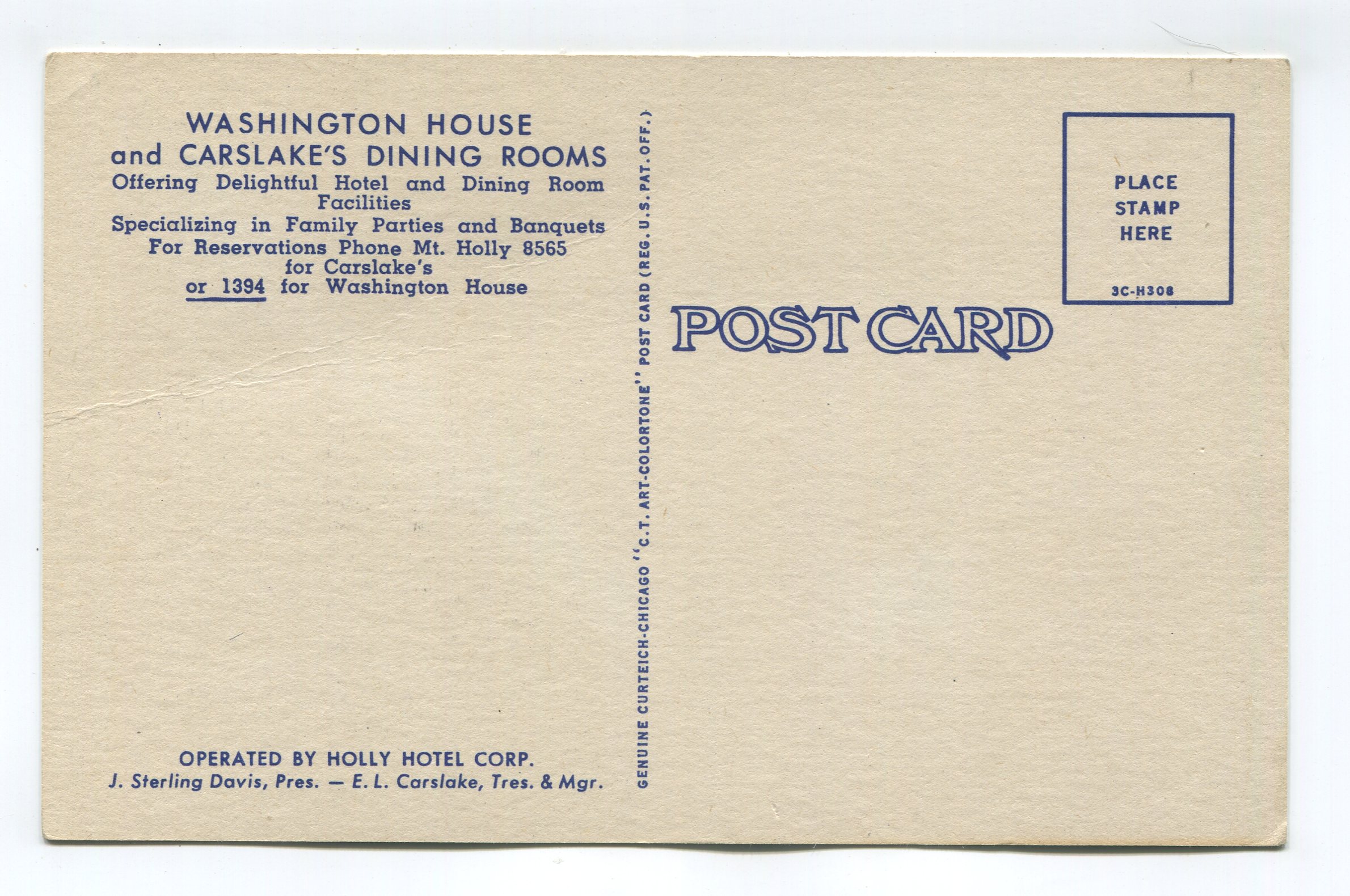 Washington House Carslake’s Dining Rooms Mt Holly New Jersey postcard