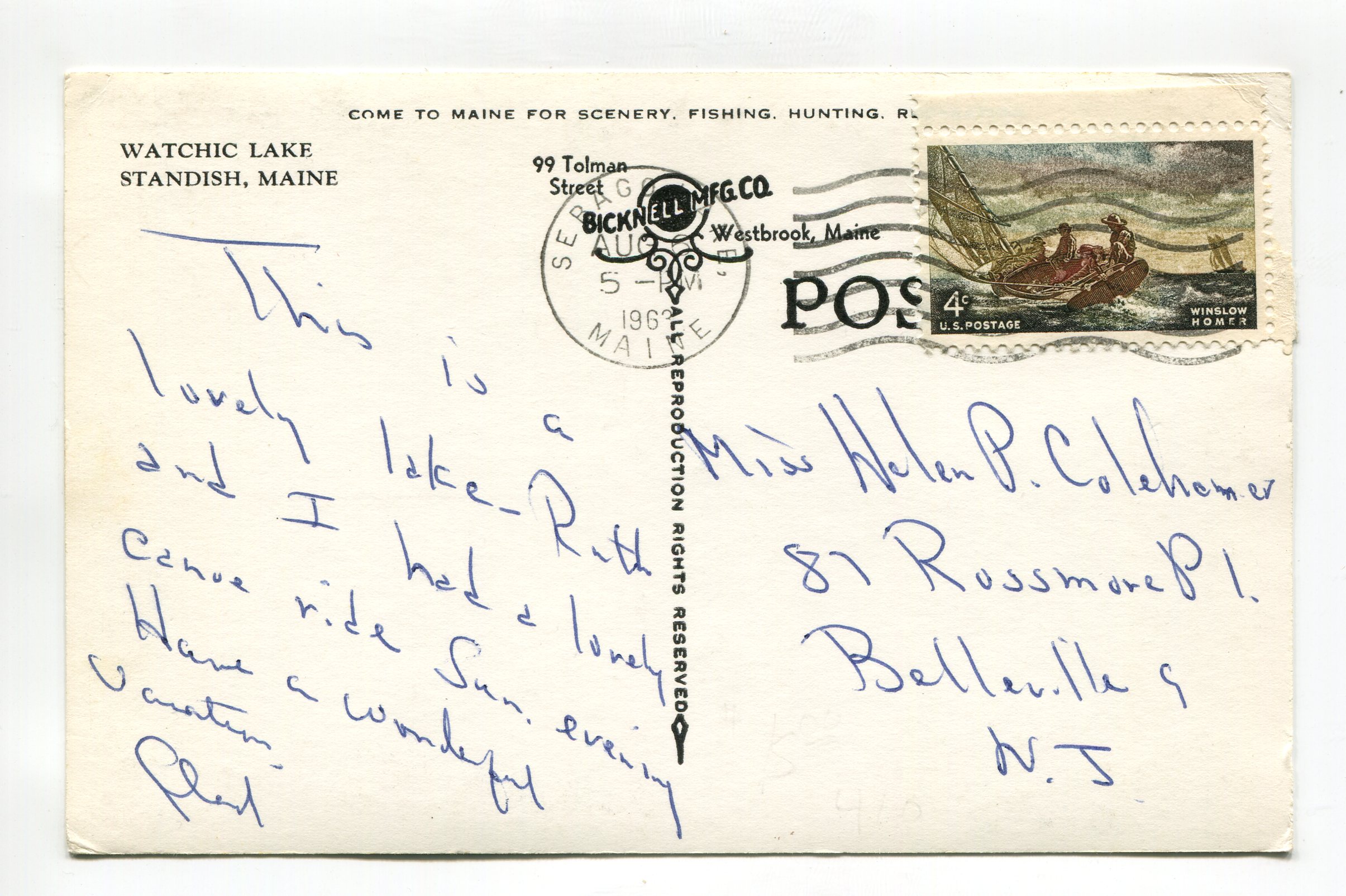 Condition – noticeable corner/edge wear, crease in corners, cancellation impression visible on card front, soiling/marks