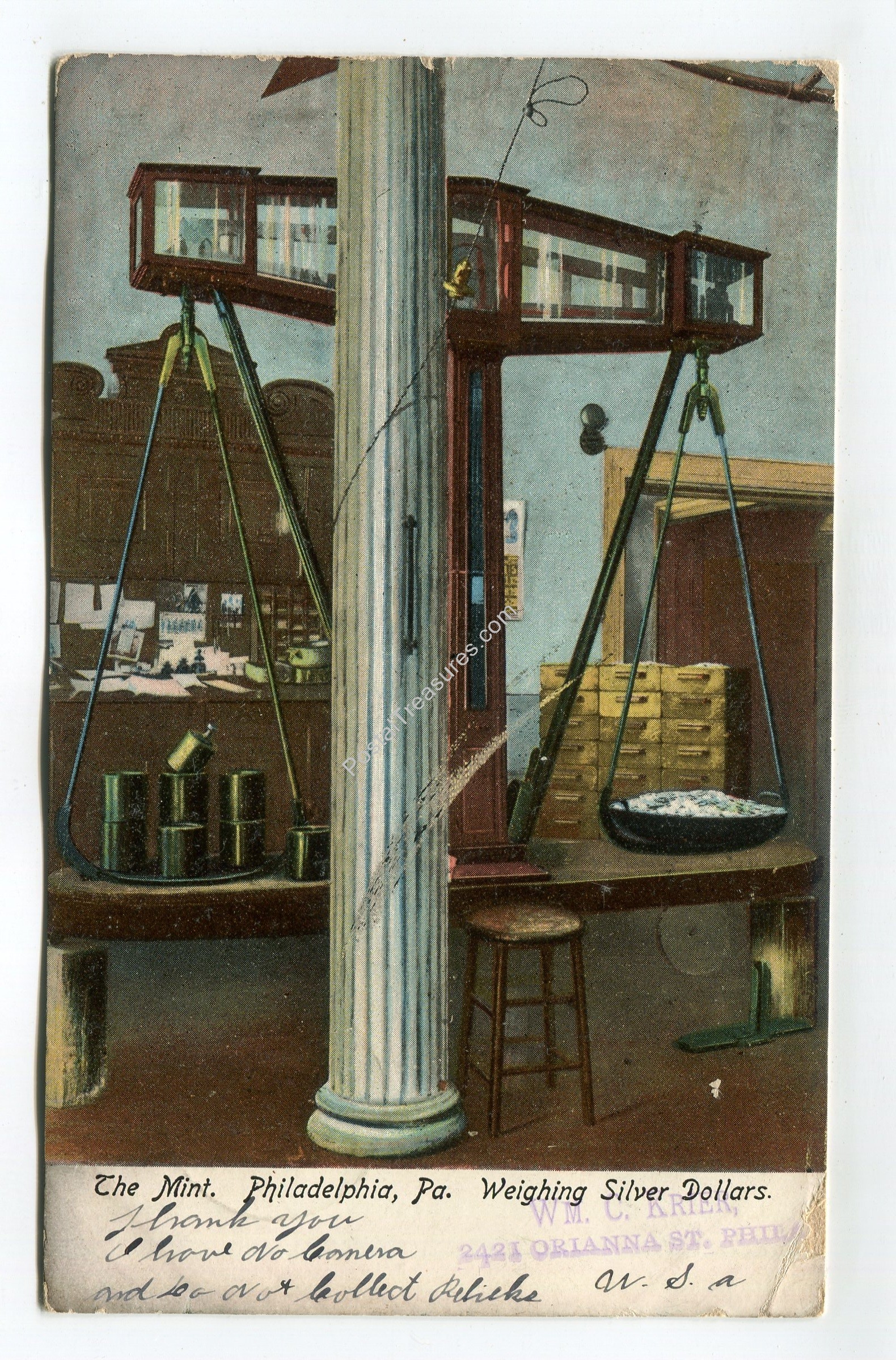 Weighing Silver Dollars The Mint Philadelphia Pennsylvania postcard